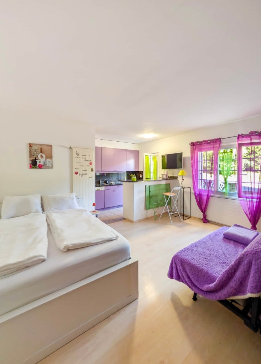 This studio with magnificent lake & mountain view is situated on the front line of Geneve Lake, in 10 mins from the center of Montreux. On the ground floor of the building you’ll find the restaurant Le Contretemps. There’re 2 ping-pong tables in the yard and a tennis club nearby. Your kids will enjoy a large playground in the front of the building. We can get you rackets for badminton or table tennis on request. No private parking. No pets allowed.