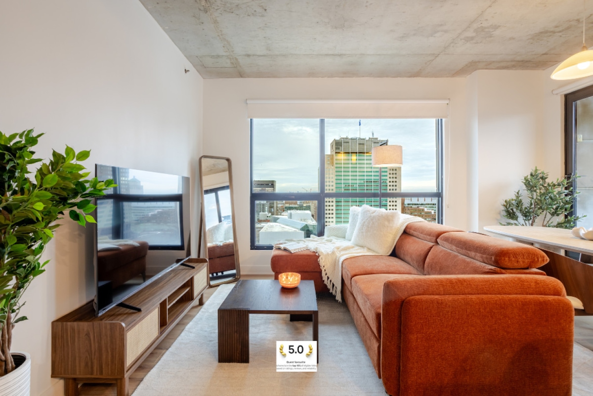 Enjoy your stay in the heart of the city ! Brand new TDC 2 downtown luxury with direct Bell Center access! Revel in comfort in our fully furnished and equipped one-bedroom condo with own private balcony! Your stay includes access to a sauna, pool, gym, skylounge, gaming room, lounge, and terrace with multiple barbecues. Free underground parking, with the subway just minutes away. Without stepping outside, the city is yours to explore. Plus, unwind with complimentary Netflix for the perfect stay