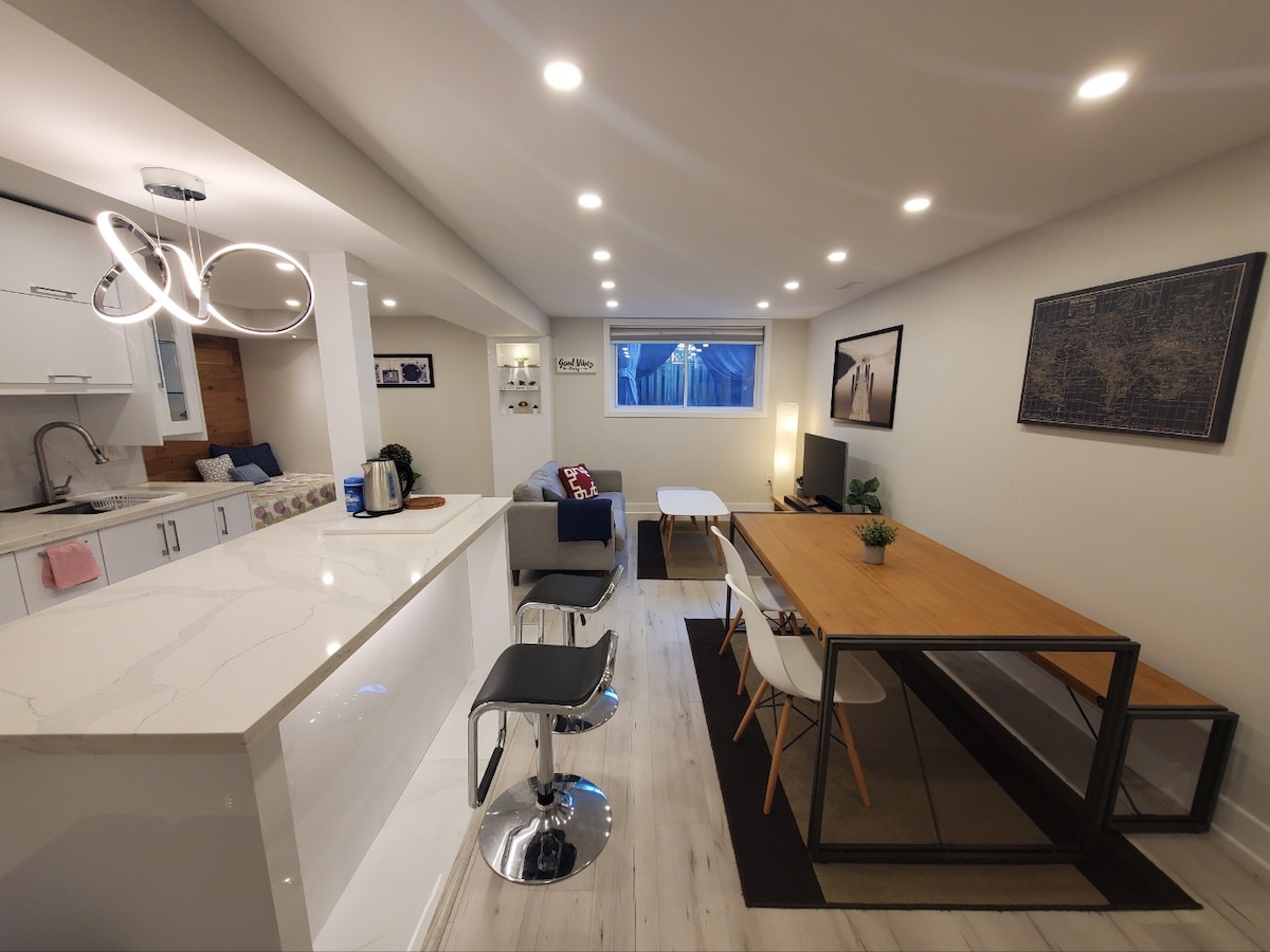 This is a compact one bedroom basement guest suite. It has a separate entrance from outside. Fully furnished living room with a double size comfy sofa-bed facing a TV. Fully equipped kitchenette including a small dining table, microwave, air fry convectional oven, refrigerator, induction stove, and all necessary cutlery. There is a washer and dryer in the unit not shared with anyone. A bedroom has a queen size bed. Great WIFI network. Walking distance to TTC, GO station and grocery store.