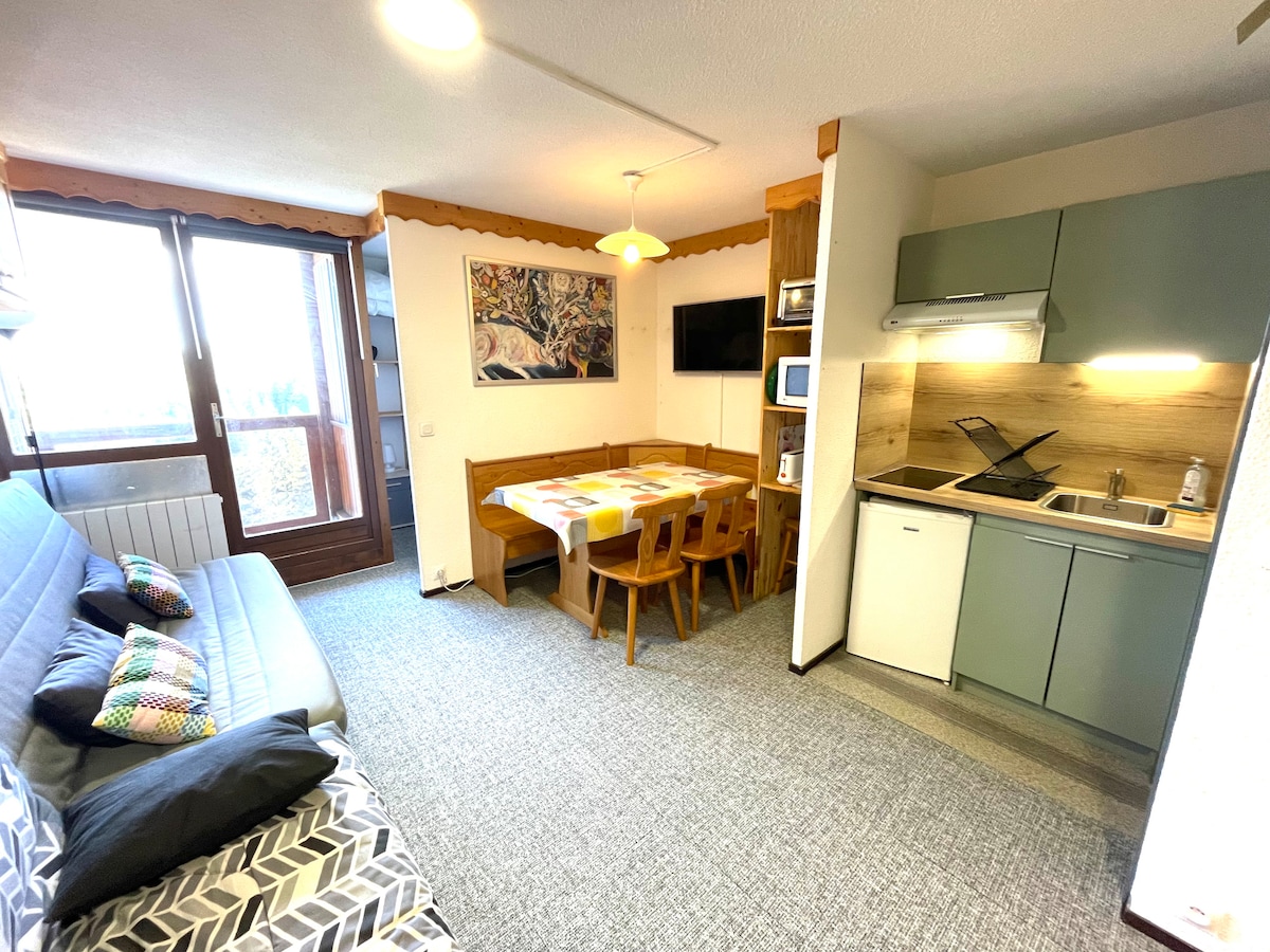 Studio 28 m2 vue sur les pistes,ski aux pieds. ESF,remontées mécaniques, commerces juste à côté. L'appartement est entièrement équipé :WIFI, grande TV, hi-fi, lecteur DVD, appareils à raclette et fondue, senseo,lave vaisselle, mini four,micro-ondes bouilloire, grille pain. Produits ménagés ,huile, vinaigre, sucre, sel, poivre, sont à disposition. Possibilité de location de draps:10 euros par personne. Navette gratuite dans la station en saison été, hiver:arrêt à 50m . caution:100 euros