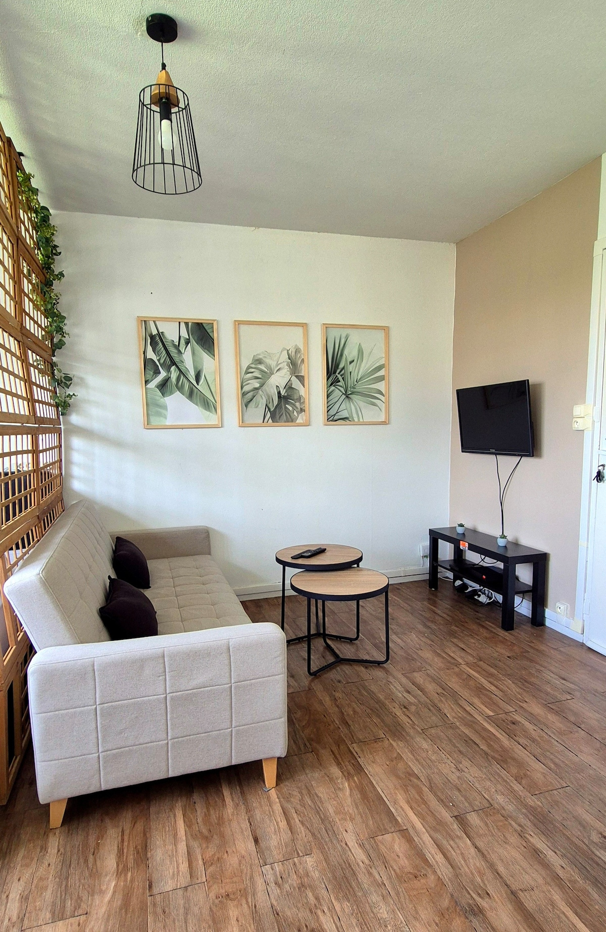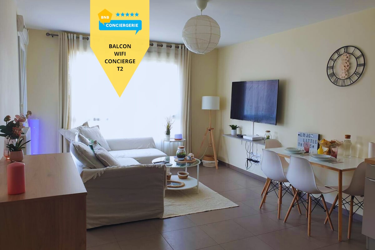 Jolie T2 chaleureux et paisible offre un séjour détente pour toute la famille. Le mobilier est de style et neuf, une cuisine équipée ouverte sur le séjour avec canapé convertible 2 places, et TV connecté, NETFLIX et Wifi, chambre avec un grand lit 2 places, salle de bain, toilette.
