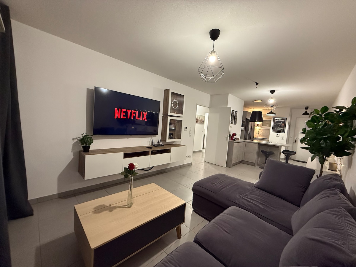 Le Patio de l’Arena ✨ T2 contemporain rénové avec belle terrasse plein sud 🌞 et garage box privé. Profitez d’un cocon raffiné et lumineux à quelques minutes du Groupama Stadium 🎯, de la LDLC Arena, d’Eurexpo et du centre de Lyon. Chambre avec lit Queen Size, salon design ouvert sur cuisine équipée, salle de bain élégante. Calme absolu 🌿 et confort haut de gamme pour séjour pro, concert ou escapade lyonnaise. Un logement signé By Villa Gaïa.