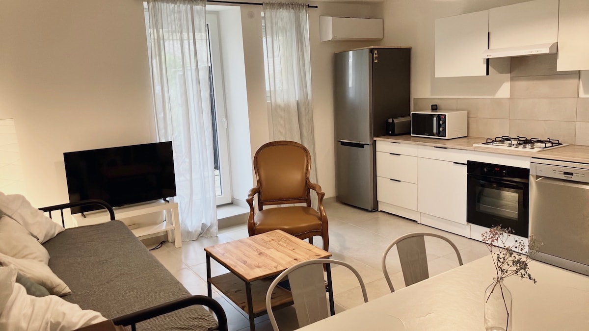 Nous vous accueillons dans un appartement climatisé entièrement rénové en 2025 composé de : - Une grande pièce à vivre avec espace salon, salle à manger et cuisine entièrement équipée. - 3 chambres avec chacune 1 lit de 160 cm, espace de travail, TV, climatiseur, salle d’eau privative avec WC. CNPE du Bugey et PIPA à 15-20 minutes, à proximité du centre-ville de Lagnieu et de toutes ses commodités. Point de départ parfait pour découvrir la région ou faire étape sur la ViaRhôna.
