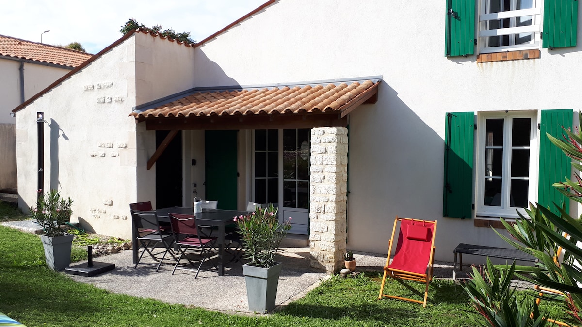 logement au cœur du village de Saint trojan les bains, à 200 m du port, du marché et des commerces, dans une petite ruelle typique, fleurie et calme. Les plages et le front de mer sont accessibles à pied et en vélo ( plage à 5 mn a pied) . Ce logement en RDC du chai, entièrement rénové en 2020, est totalement équipé pour votre confort. La place de parking privée, le jardin privatif au logement, avec table, et parasol, au cœur du village rendent votre séjour parfait, en famille ou en couple.