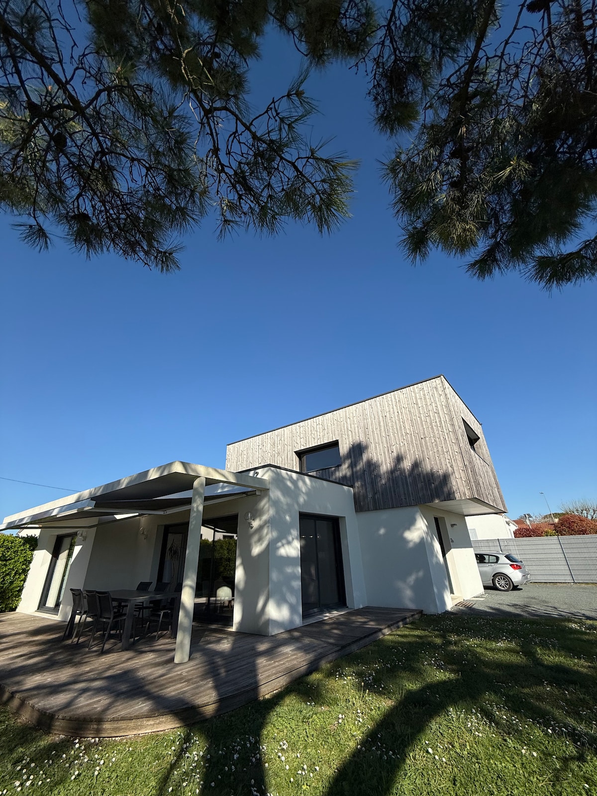 Spacieuse maison d'architecte de 2013 avec 2 chambres, 2 salle d'eau et jardin pour 4/6 personnes avec grande terrasse. WIFI, arrivée autonome possible. En option : linge de lit 25€/ lit (à régler à votre arrivée). A noter: le jardin est clôturé sur 3 côtés et donne sur une allée privée.