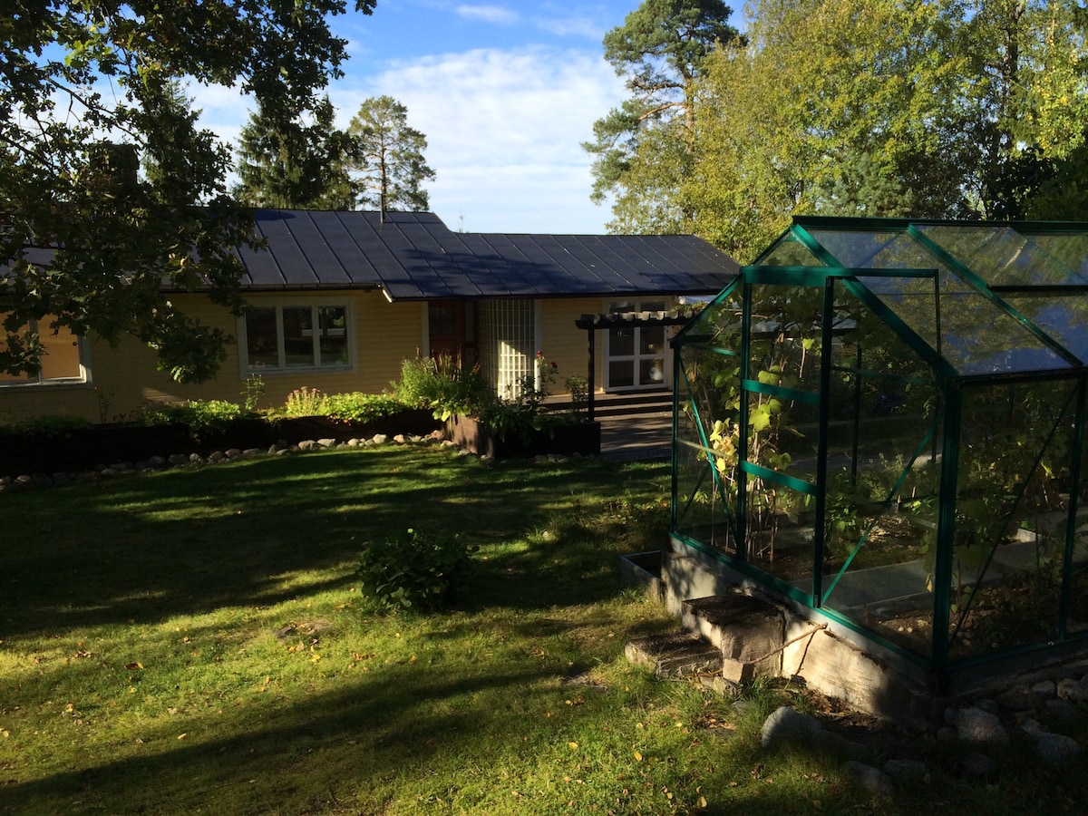 Welcome to Karlsudd, just outside of Vaxholm. This has been a paradise for hundred years with summer villas and permanent residences. Our guest house which is 50m2 is located below the main villa with its own sundeck with bbq, sea view and 300 meters to rocks or beach when you wish to take a swim. Bedroom with double bed and loft with two single beds (The loft is not suitable for children) It is 1.5 km to Bogesund Castle with hiking trails and 4 km to the Golf Club and 1 km to the Vaxholm boats.