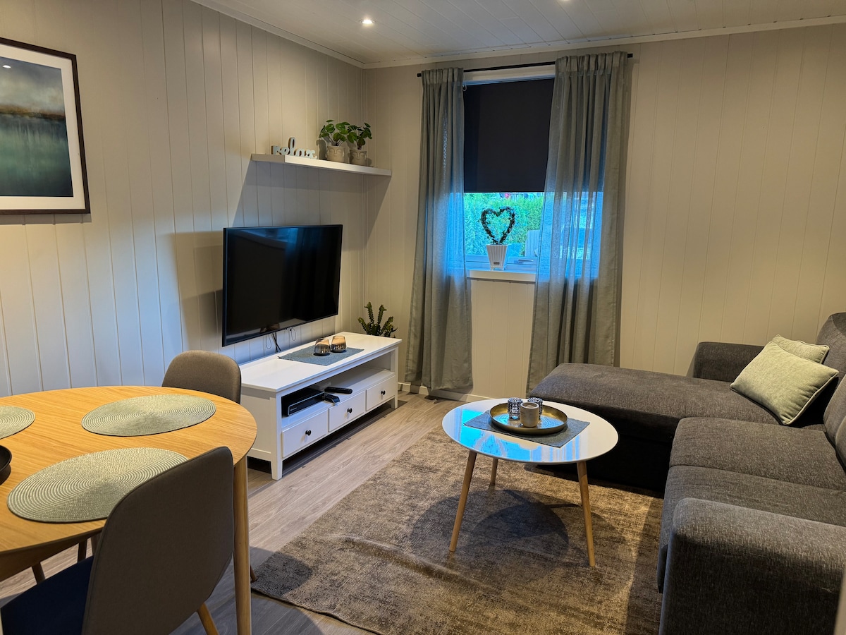 Lys og moderne hytte. Nyoppført i 2018. Spotter i tak, kjøleskap, oppvaskmaskin, komfyr og stekeplater. Spisebord med plass til 6 stk. Kabel-tv og sofa. Flislagt bad med regnfallsdusj. 2 soverom med dobbeltseng pluss hems med plass til 2-3 stk. Utsikt mot fjell og hav. Terrasse med utemøbler og grill.