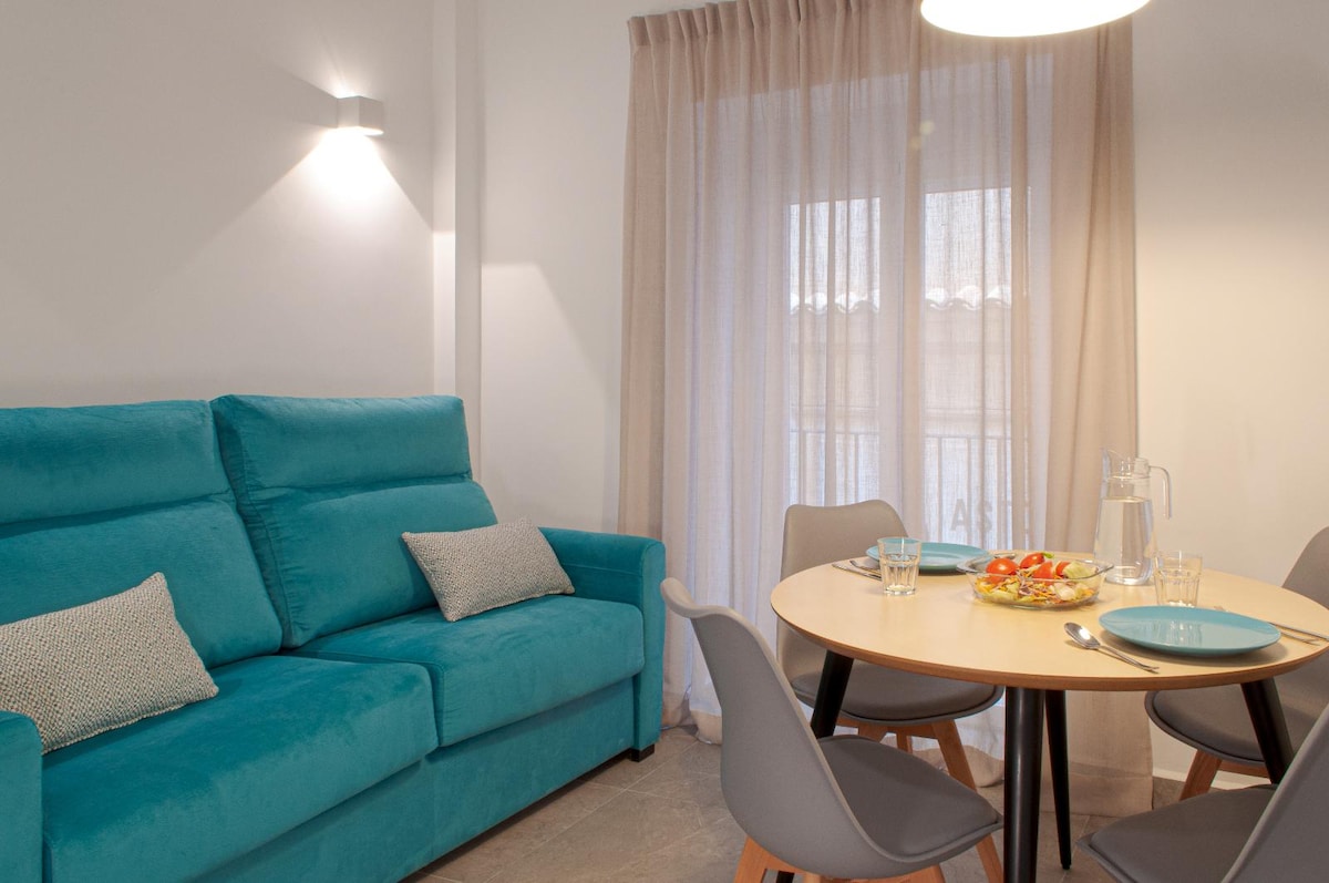 Moderno apartamento de un dormitorio con 1 cama matrimonial de 150cm, Baño privado con ducha, lavabo, secador de pelo y amenities. El salón dispone de un sofá cama de 1,35m, mesa de comedor con cuatro sillas, cocina equipada con vitroceramica, horno, nevera, menaje, microondas, tostadora, hervidor de agua y cafetera. Servicio desayuno de 8:00h a 10:30h en nuestra TERRAZA de Hotel LA MILAGROSA (bajo el suplemento).