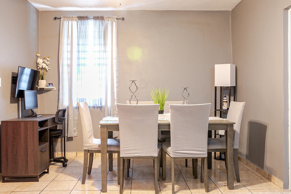 Apartment close to stunning beaches at 10-min. drive: Playa Puerto Nuevo, La Esperanza, Mar Chiquita, Los Tubos. Perfect location right next to Highway 22, mini-market, beauty salon, and restaurants, just minutes from attractions like Charco Azul, Ojo de Agua, Costa Norte Climbing Gym, and theaters. A perfect place for a getaway with family or friends, or for work. Accommodates 6 people, with 2 bedrooms, A/C, TV/Netflix, Wi-Fi, parking, a kitchen, power generator and electricity generator!