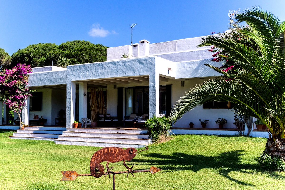 Beautiful villa near the beach in the Roche, Conil (Cadiz) We rent all year round (for fortnights in July and August) and can accommodate up to 8 people. There is WiFi Internet and Netflix Plus, 2 smart TVs, one 70'' screen. The house, 150 m2 (200 including terraces) and 600 m2 of garden, is a typical Andalusian tile construction totally and perfectly equipped and decorated with style, for maximum comfort and enjoyment. It is only 50 meters from the beach. So close that you can go barefoot.
