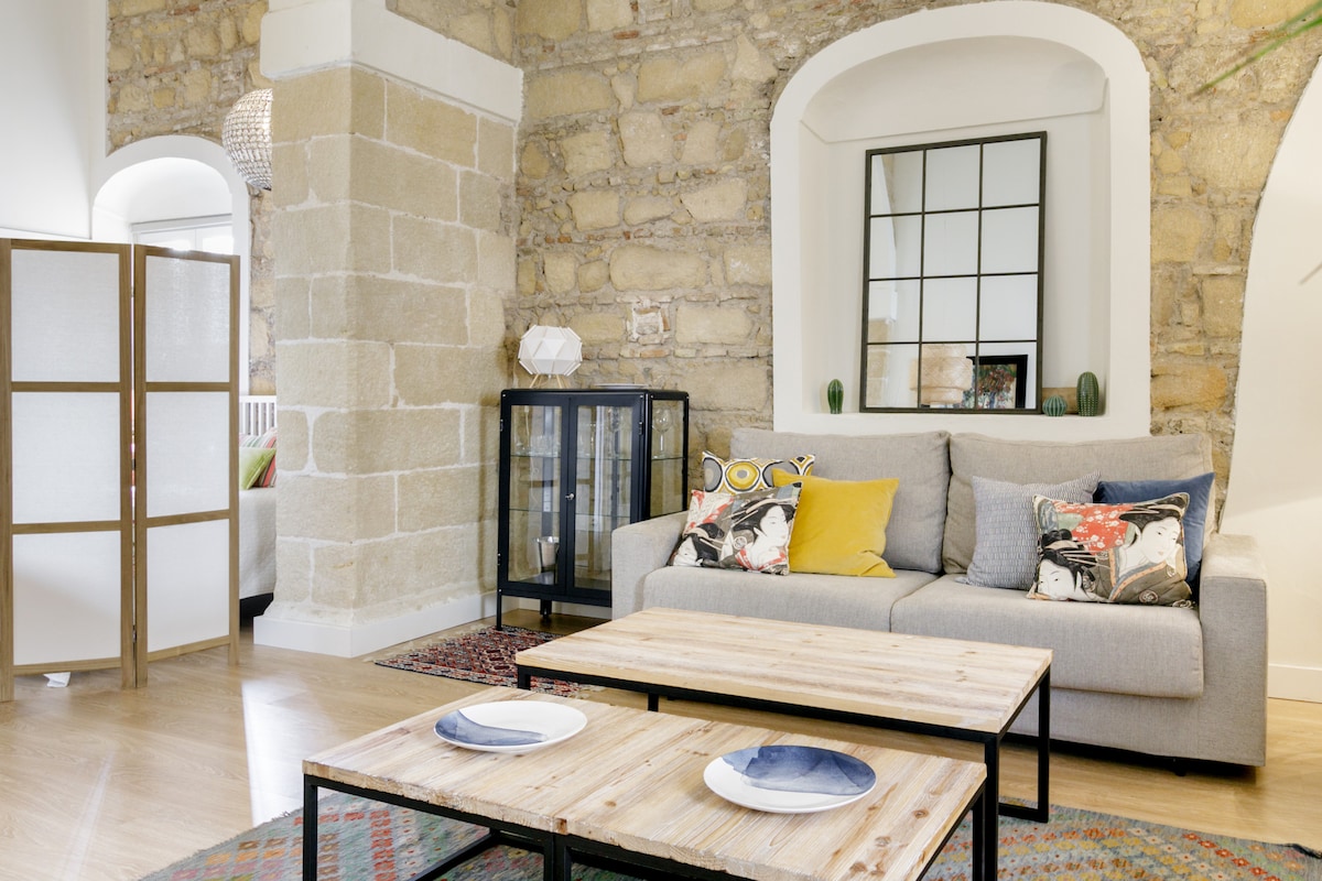Apartamento para adultos y niños mayores de 10 años. No fumadores. Aparcamiento incluido en el precio de la reserva. El Loft se ubica en una bodega jerezana rehabilitada del siglo XVIII. Es un espacio diáfano bellamente decorado y completamente equipado. Está situado en primera planta con ascesor y cuenta con una terraza amueblada de 20 m2 bajo los soportales del patio en planta baja. Es un lugar muy tranquilo para desconectar y disfrutar de la paz y el silencio en un edificio histórico.