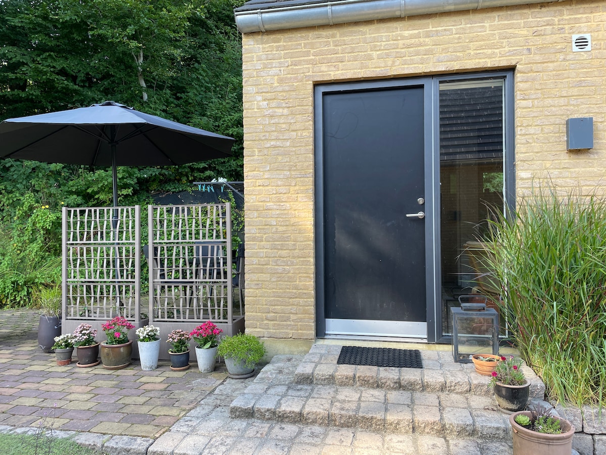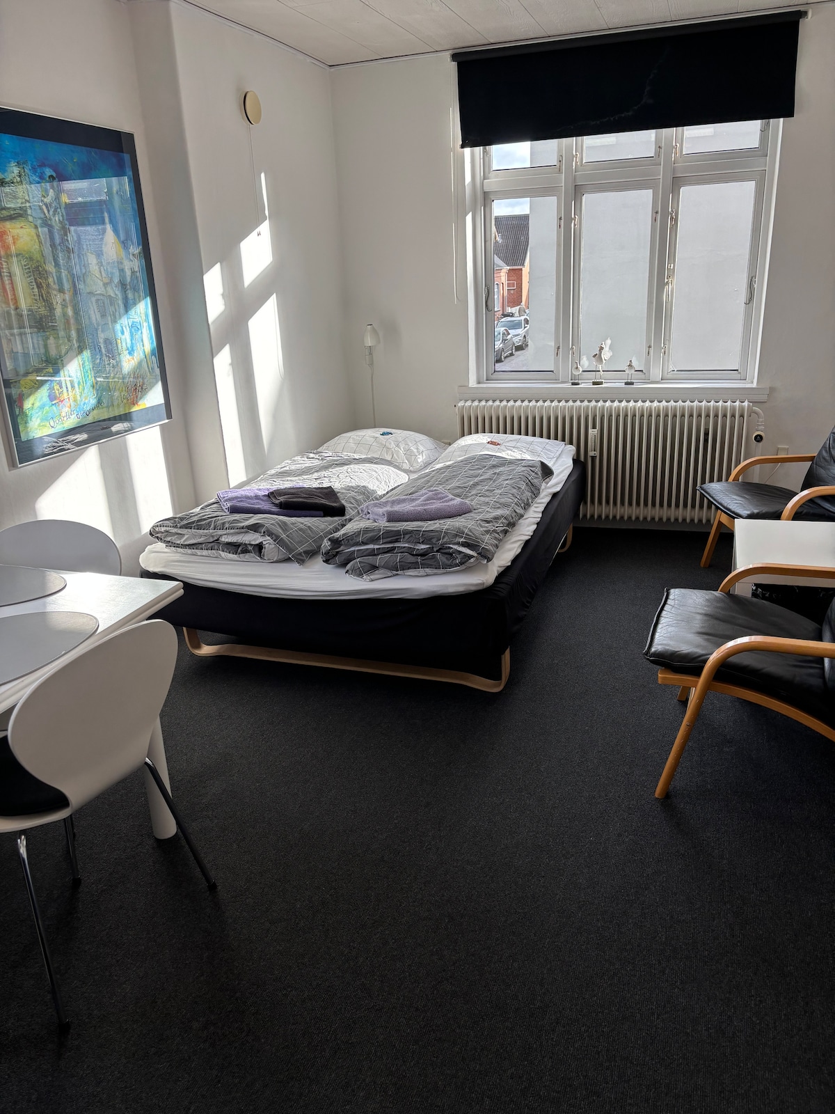 Smagfuldt indrettet nyrenoveret lille gæstehus med privat overdækket indgang og parkering lige ved døren. Gulvvarme, minikøkken (egner sig ikke til decideret madlavning) og fred og ro midt i Vejle. Udendørs videoovervågning for din sikkerhed. Rengøring og sengetøj/håndklæder er inkluderet i prisen. Bemærk at det er en lidt høj luksus continentalseng, der måske ikke egner sig så godt til ældre mennesker. Gæstehuset består af et nyrenoveret badeværelse og et større opholdsrum/soveværelse.