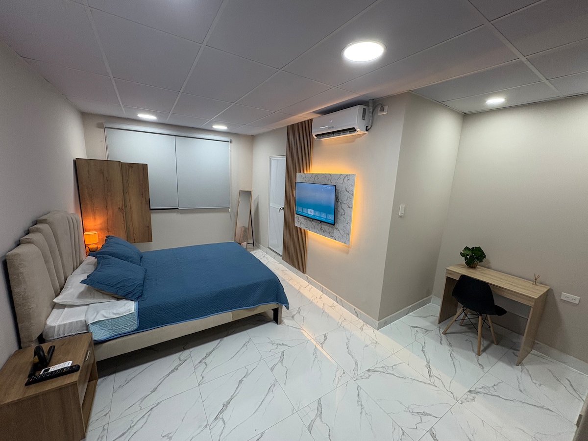 Disfruta de este moderno alojamiento céntrico donde podrás encontrar fácil acceso a todo. Ubicado en el sector más comercial y bancario de la Ciudad. El espacio: Habitación cómoda ideal para pareja. Smart Tv con Netflix Wifi Baño privado con agua caliente Aire acondicionado ✨Recomendaciones: • A pocos mt del alojamiento se encuentra estacionamientos de pago con vigilancia 24/7 y tarifa accesible. ✅ • Al ser un lugar céntrico, tiende haber ruido externo sobre todo en horario laboral.