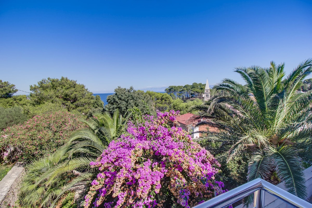 Pogled na kulu i dvorište puno cvijeća te velika terasa su glavne značajke ovog apartmana. Sastoji se od jedne spavaće sobe sa velikim bračnim krevetom, kupaone, dnevnog boravka sa kaučem na razvlačenje, kuhinje sa stolom i stolicama te male biblioteke. Položaj je u samom centru Velog Lošinja, nedaleko od marketa i od plaže.