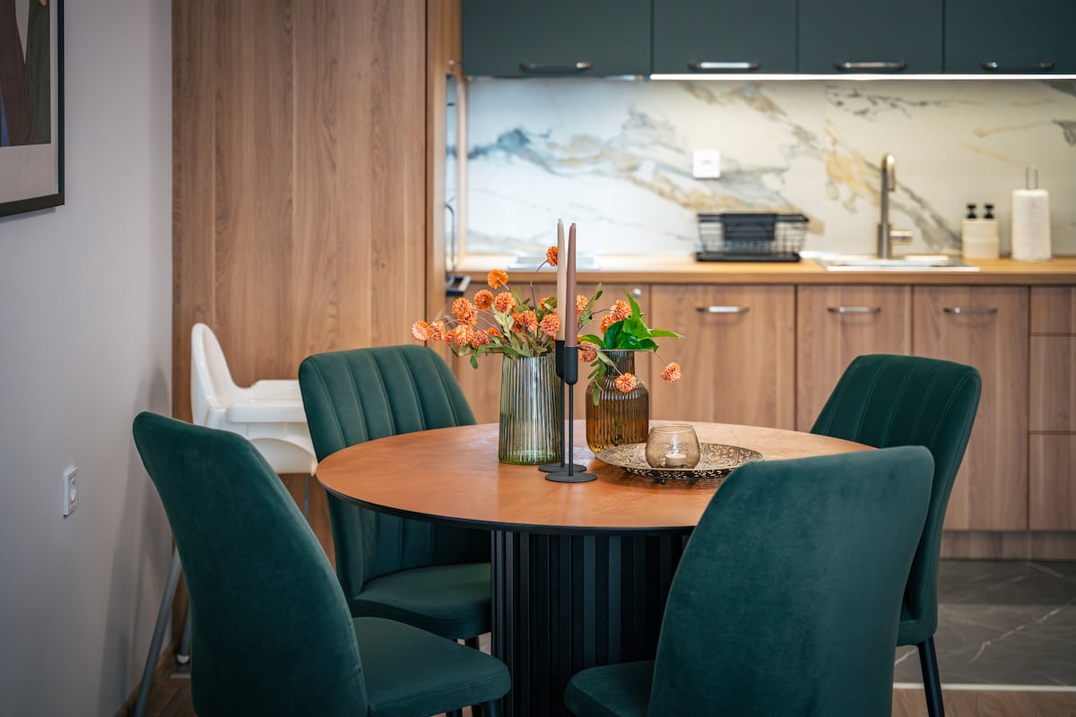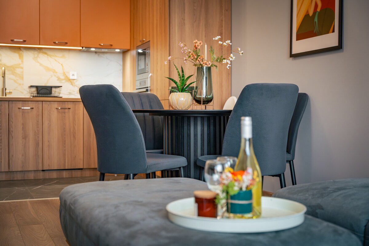 Trinavis Terracotta invites you into a calm, refined space. Just steps from the city’s largest park and a short walk to the old town, this unit offers two bedrooms, two bathrooms, a fully equipped kitchen with dining area, a bright living room, and a private terrace with park and hill views. You’ll enjoy fast Wi-Fi, private parking, gas heating, and air conditioning in every room. Ideal for couples, families, or business travelers,serenity and convenience in Veliko Tarnovo’s best location.