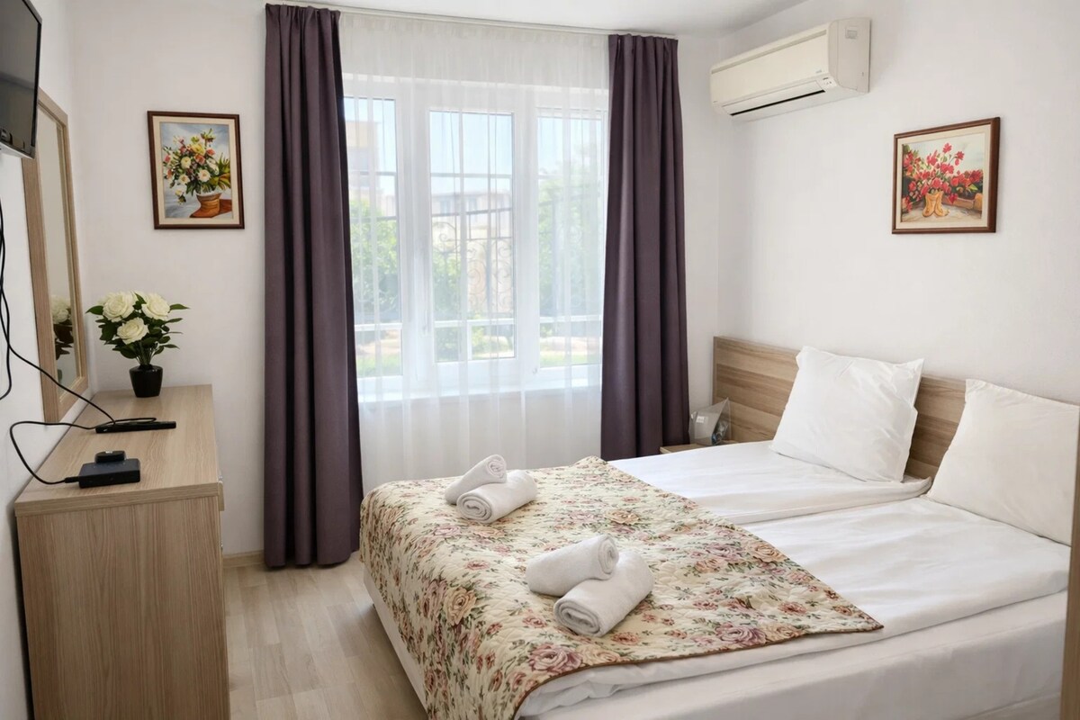 Studio - up to 2 persons - Spacious room with kitchenette, bedroom and balcony. The kitchenette is fully equipped with cabinets, built-in oven, ceramic hot plates, aspirator, microwave oven, refrigerator, kettle for hot water, toaster, dining table with chairs. Each rooms is equipped with TV. The premises are air conditioned, and for full comfort the apartments are equipped with hairdryer, iron and ironing board.