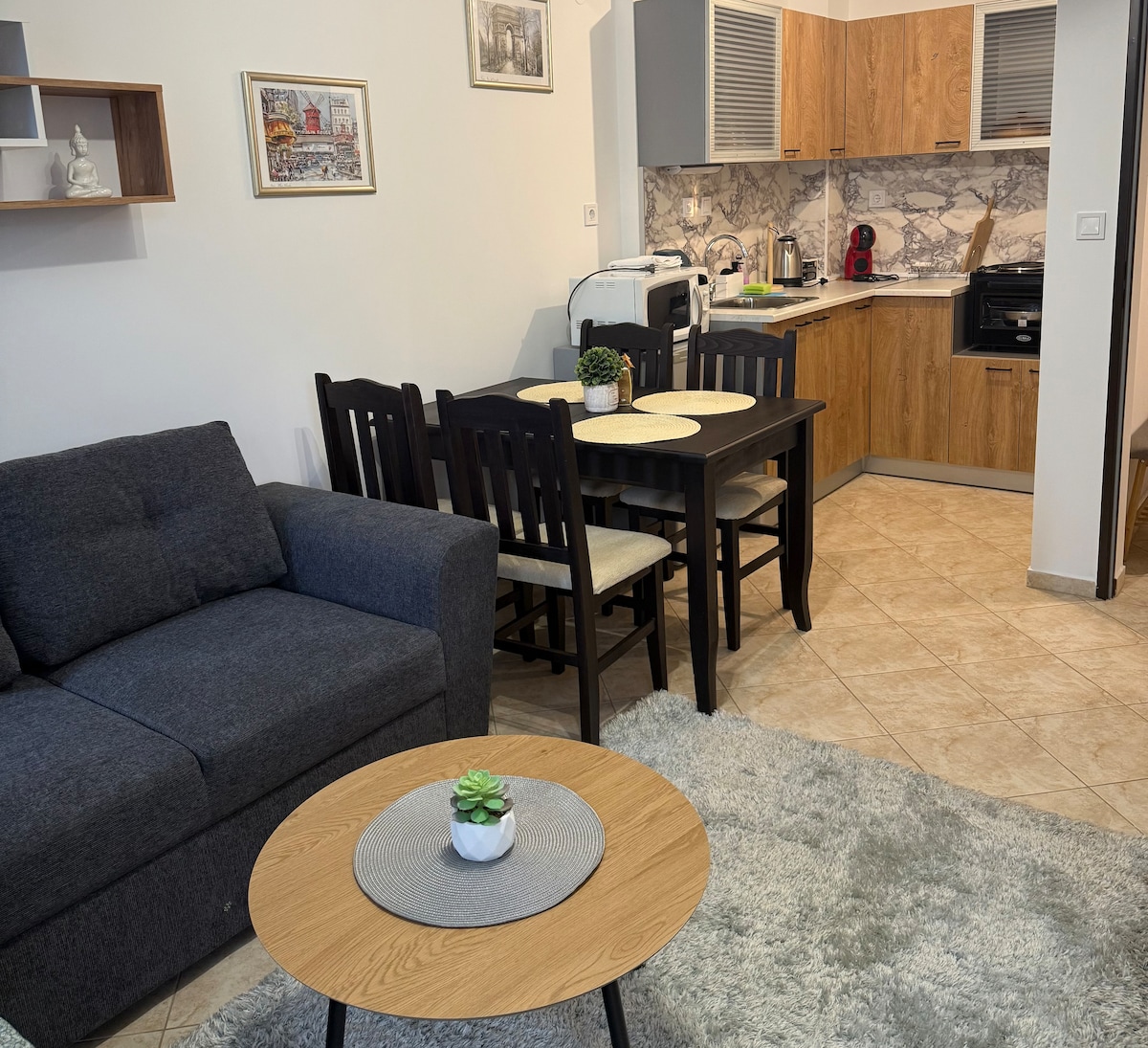 Stylish one bedroom apartment with one double bed and one sofa bed suitable for family or two persons .With full kitchen and terrace! Apartment is in a very quite street in just 5 minutes to the center.