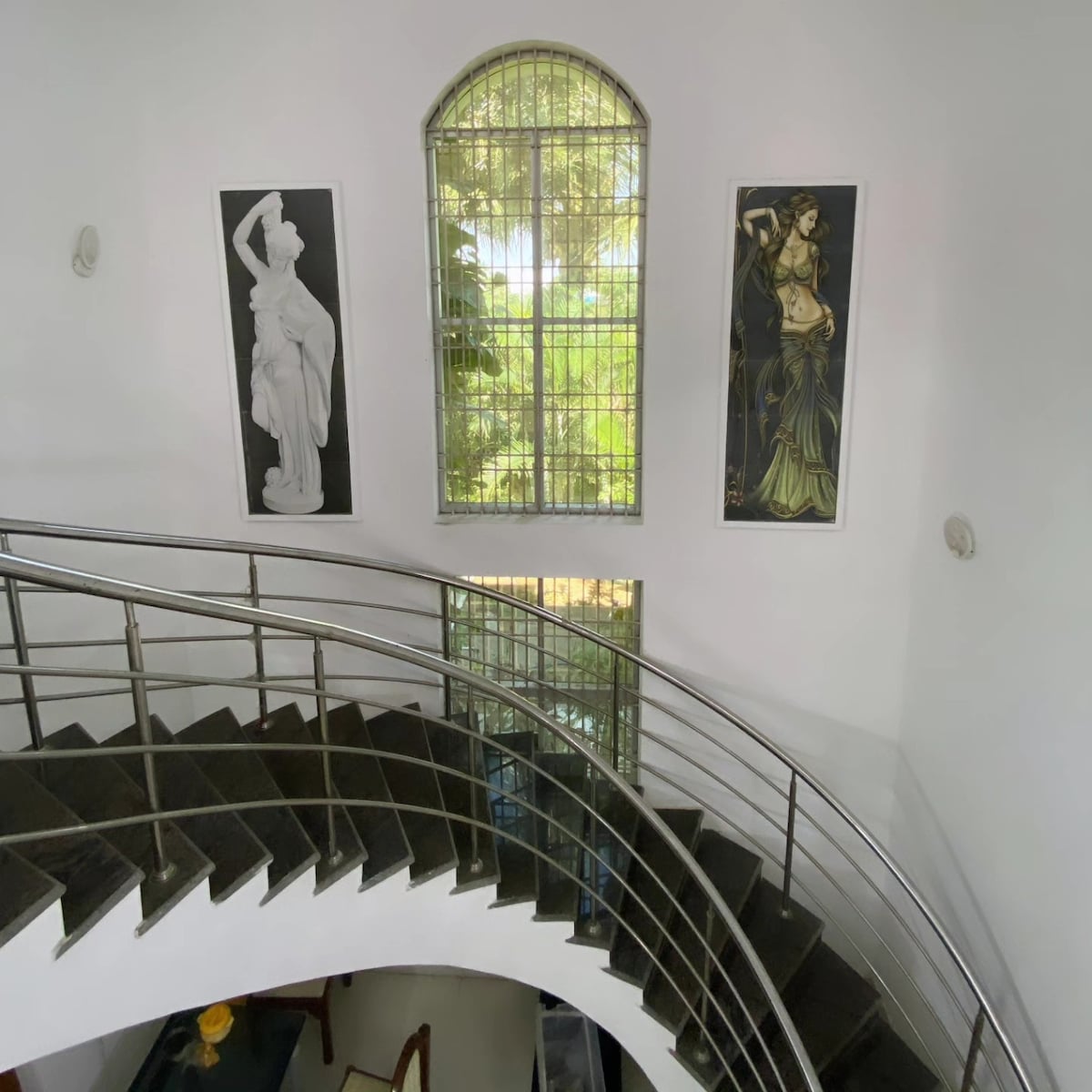 Beautiful large home, traditionally and stylishly furnished, set in lush gardens in the upmarket area of Gandhi Nagar. 5 minutes walk from high street with schools, restaurants and 5 minutes from Katpadi rail station. Outdoor porch, badminton court, kitchen and gift shop in the compound.