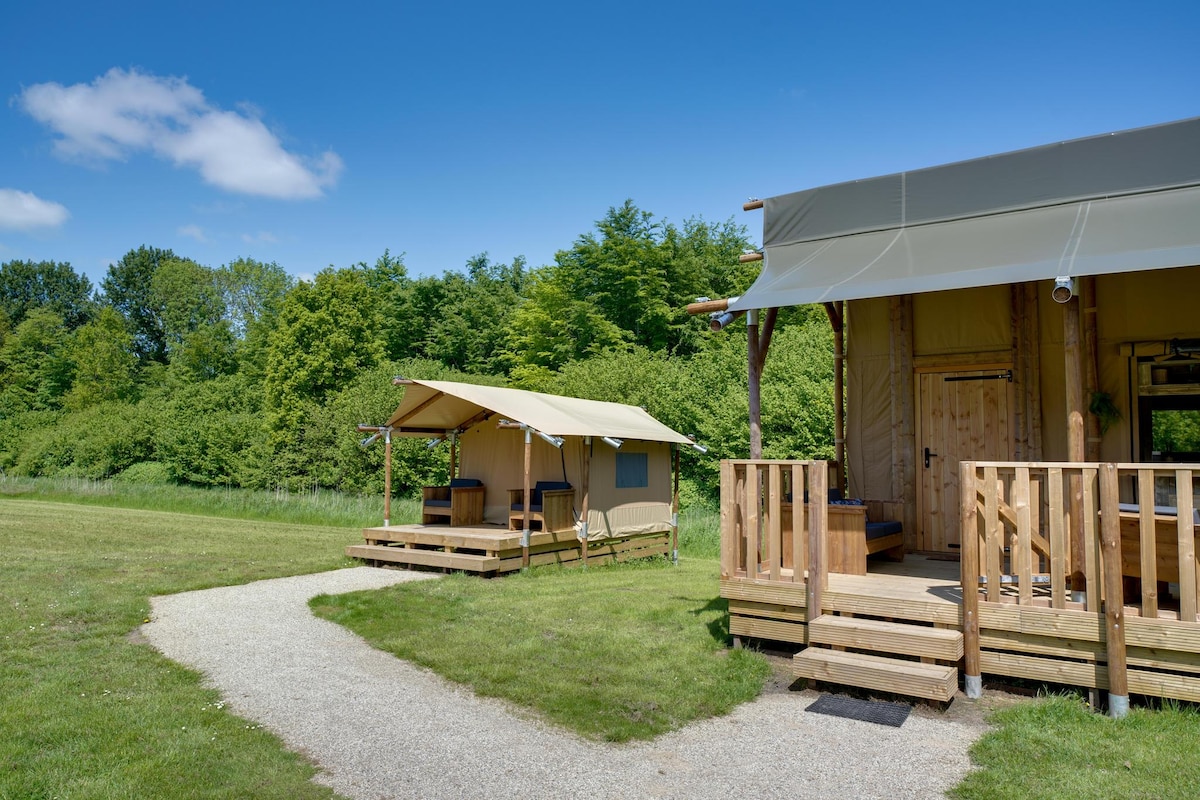 Mooie stijlvolle safaritent te huur geschikt voor 4 personen met eigen sanitair en een compleet ingerichte keuken. Er is een slaapgedeelte met een 2 persoonsbed en een gedeelte met een stapelbed. voor de tent zit een veranda met een heerlijke bank en een picknicktafel. Het is mogelijk om een tent of caravan bij te plaatsen. Er staan 2 safaritenten op een ruim opgezette mini camping, in de prachtige omgeving van Winterswijk.