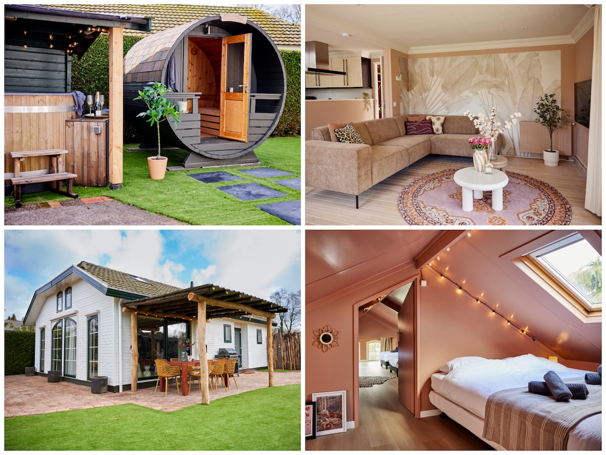 Sfeervolle bungalow in het bos met privébioscoop, infraroodsauna en zonnebank. Ruime badkamer met ligbad, stortdouche en apart toilet. Gezellige woonkamer met open haard, ruime keuken en eettafel. Twee slaapkamers, waarvan één met hemelbed. Grote tuin met terras en luxe BBQ. Geniet van rust, ruimte en comfort!