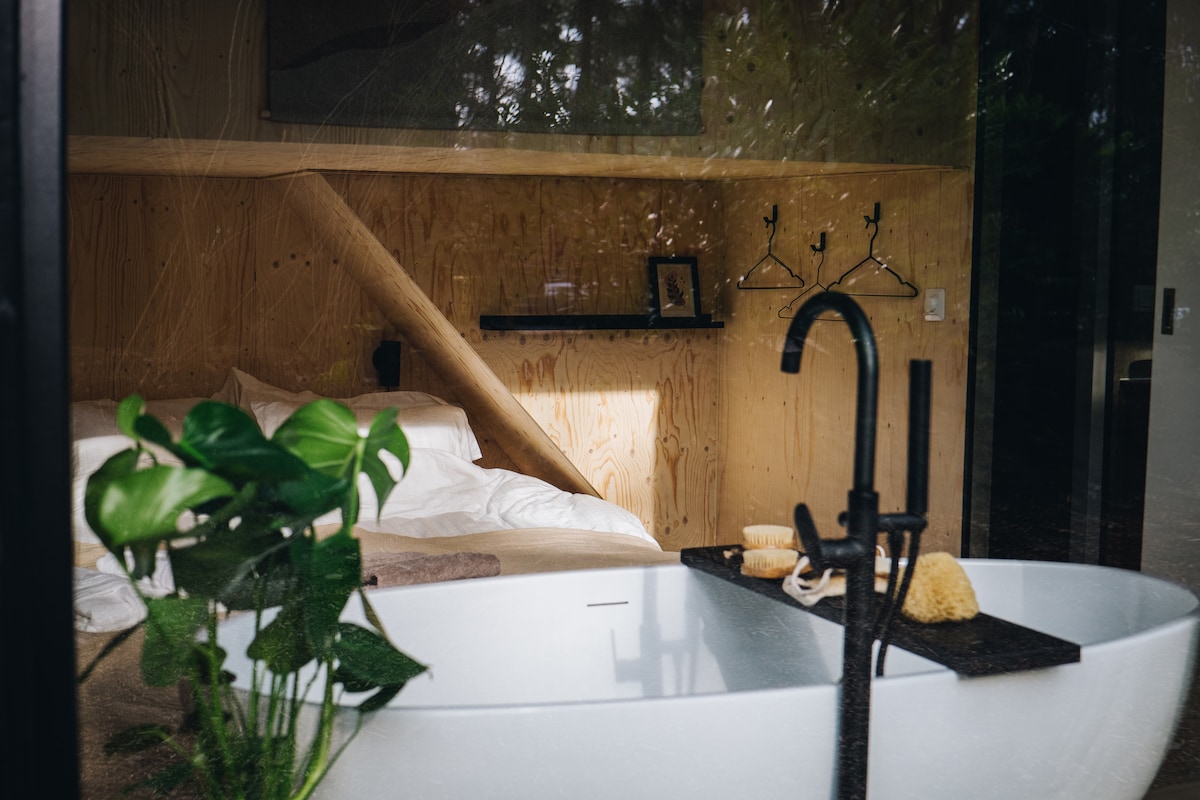 Op de Veluwe in de bossen bij Nunspeet vlakbij de Zandenplas staat het spiksplinternieuwe Vague Tiny House. Een klein plekje vol geluk en rust. Dit Tiny House van 36m² is voorzien van alles om een geweldig verblijf te creëren. Beleef het bos, de prachtige omgeving en het knusse huisje met alle luxe inclusief een groot vrijstaand bad, bio ethanol plafondhaard, beamer en alle overige luxe die je maar kunt bedenken! Zo heb je alle faciliteiten om de hoek, terwijl je midden in het bos slaapt!