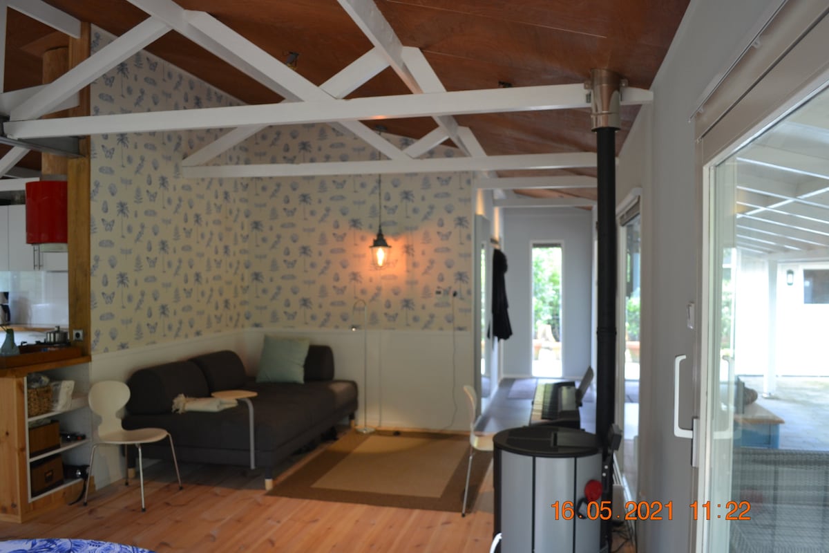 1960s vacation cottage transformed into a cozy Tiny House, equipped with all amenities yet retaining a basic charm. A delightful mix of wood, comfort, and tranquility. Through the stained-glass windows, you'll climb into your comfy bed, waking up to the sound of birds in the morning. Light up the wood stove, play a game, or watch a movie on the home cinema if you're not in the mood for a walk in the woods.. You can also use our bikes to easily reach the Veluwe or Veluwemeer.