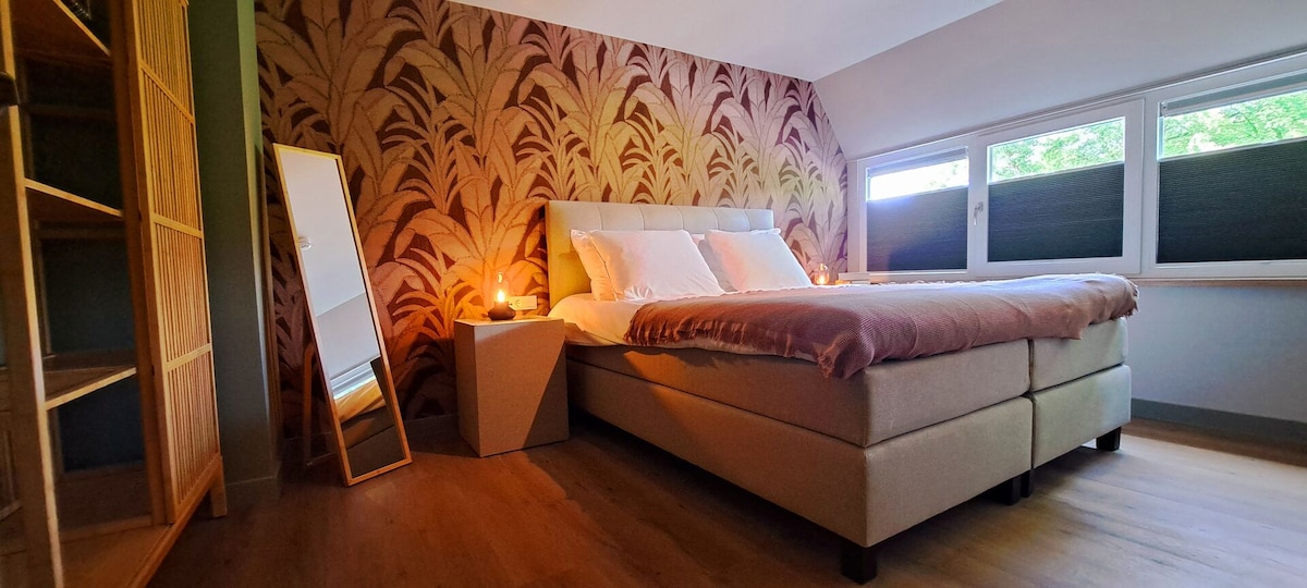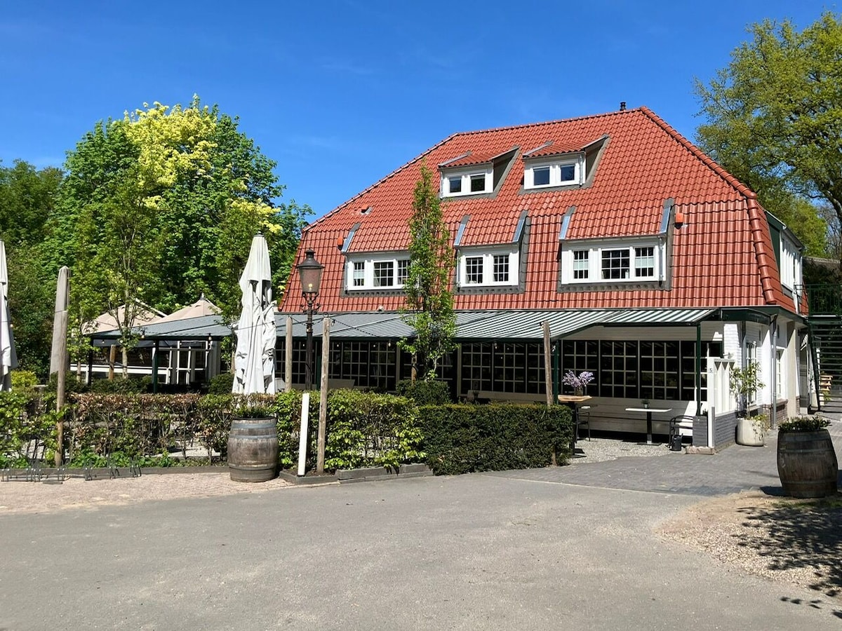 Suite “Dassenburcht” – 70 m² spacious and atmospheric with a beautiful view Suite Dassenburcht is a spacious and comfortable place to stay, perfect for families or groups wanting to enjoy the Veluwe together. This accommodation offers two bedrooms: one with a high-entry box spring double bed, and one with two high-entry box spring single beds, providing plenty of space for everyone. The large living room is cozily furnished with a comfortable sofa and a lovely armcha