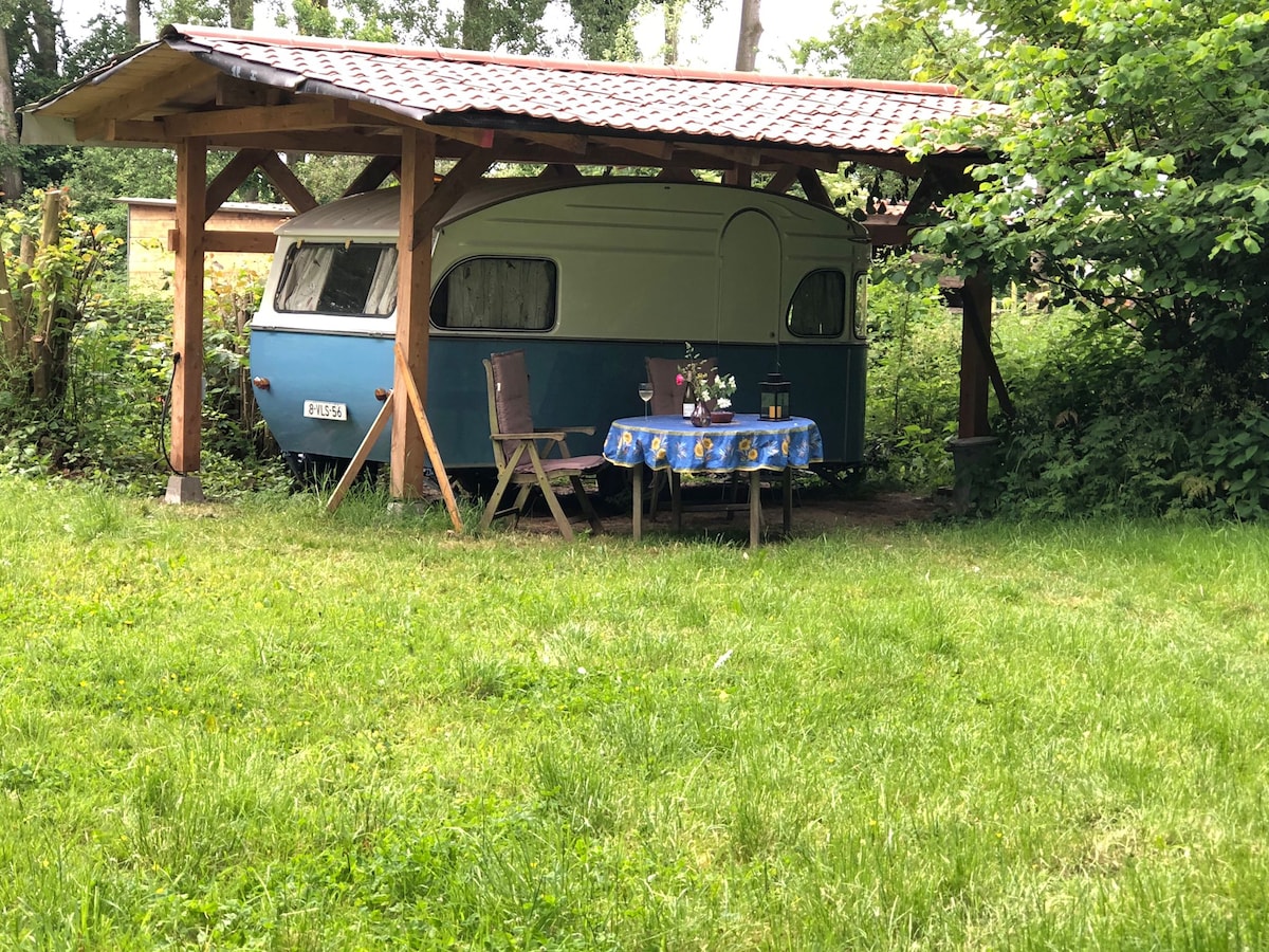 Deze prachtige vintage caravan, staat op een groot stuk tuin. Als kampeerder ervaar je echt de rust en de ruimte. Het stuk weide van 150*100 deel je slechts met 2 andere kampeer plekken. Het is een grasland met fruitbomen en omheind door bomen en een haag. In de tuin is een natuurlijke zwemvijver aanwezig om in te zwemmen. Het is een caravan uit 1974. De caravan is in no-time verwarmd met het aanwezige kacheltje. De toilet/douche ruimte is op 50 meter afstand.