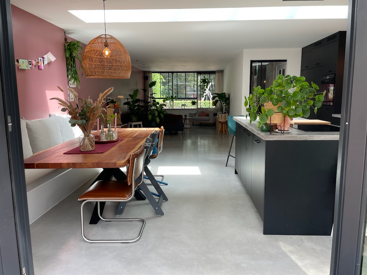 Spacious modern family home with 4 bed rooms, fully equipped kitchen and a garden. Our home is situated in a quiet and green neighborhood. There is a fully stocked bath room, 2 toilets and 4 bed rooms with fresh linens. You'll love the cozy living room with 65" tv. The home gym and washing machine are also available for you to use. Supermarkets, public transport and park are at 5 min walking distance, and you can park your car(s) in the private parking in front of the house.