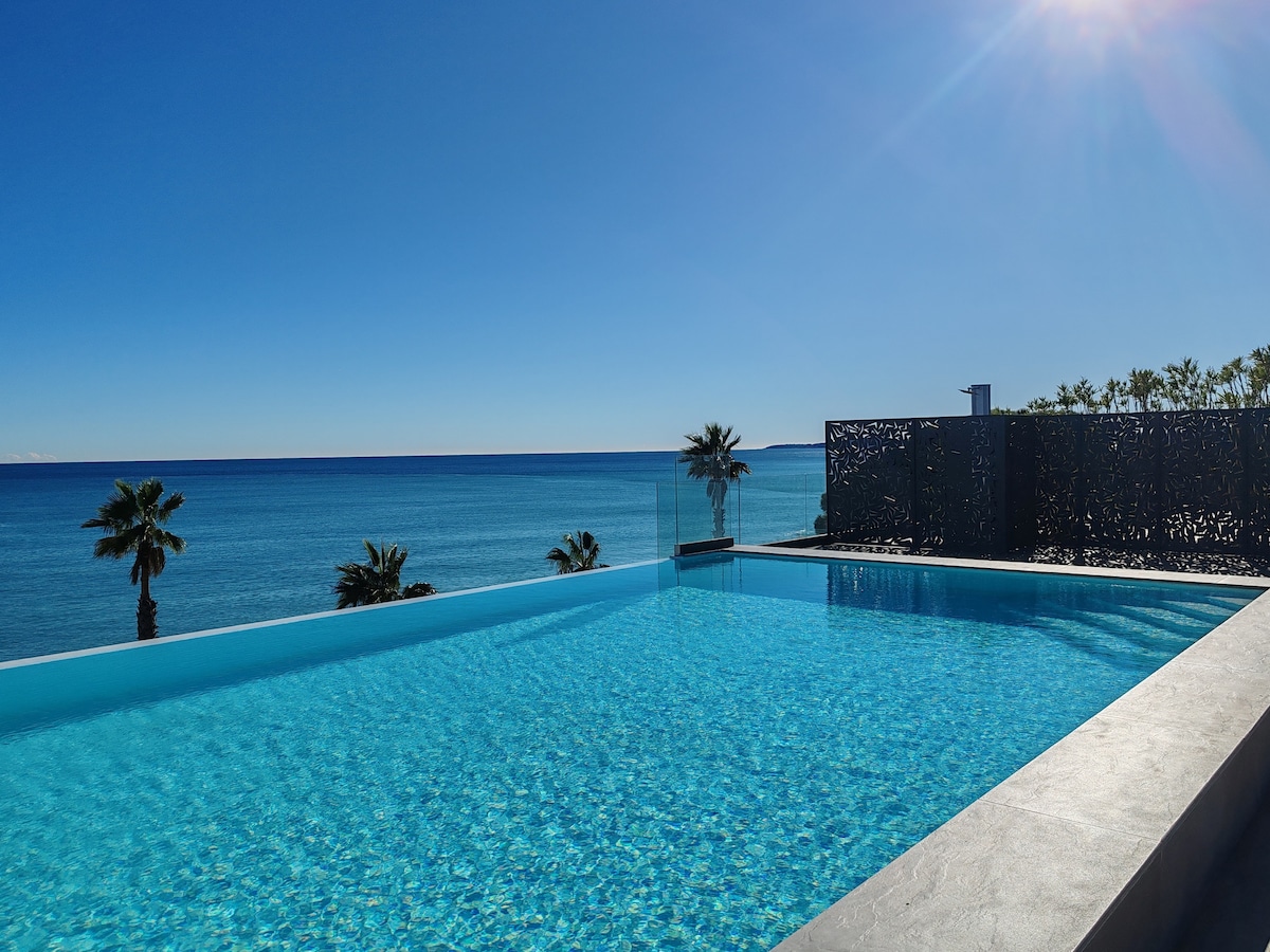 "ANTIBES LES PINS RESIDENCE" -2 BR WITH 3 TERRACES-SEA FRONT-LAST FLOOR-EXPO EAST/SOUTH/WEST... Sea facing Apartment located on the top floor of a luxury residence just above the EXFLORA Park. Direct access to the beach (100 m)-No road to cross. Secure infinity pool with waterfall+solarium as well as a paddling pool & sanitary area: Open all year round and supervised in July+August. Reduced-mobility access (access to basement, apartment, swimming pool and beach).