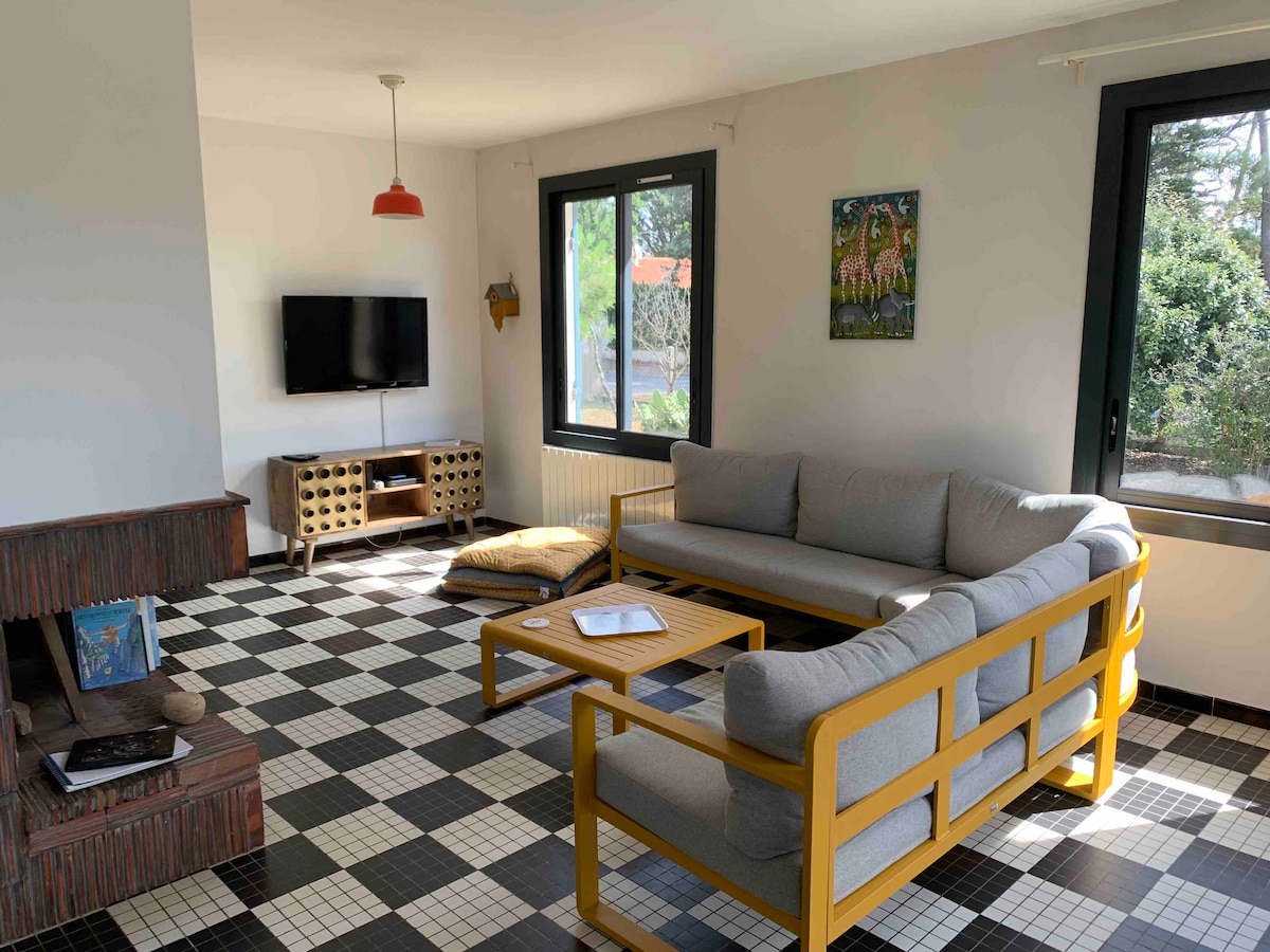 A Hourtin-plage, à quelques pas de l'océan et à proximité des pistes cyclables, des commerces et restaurants de cette petite station balnéaire réputée pour le surf, La villa Bikini, charmante maison bois entièrement rénovée et décorée avec goût vous enchantera :) Nos voyageurs pourront bénéficier gratuitement d'un accès au tout nouveau parc aquatique de 9000 m2, Aqua Pirate, lagon, toboggans, bain à remous.. situé au sein du camping 5* à 150 m de la maison. (Ouvert mi/fin Mai à mi-Septembre).