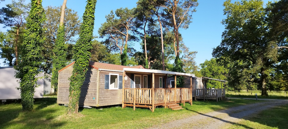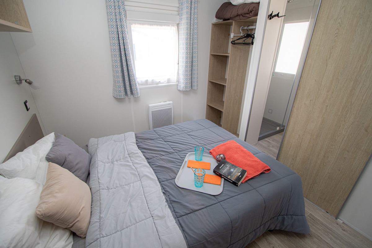 MobilHome 4 à 6 personnes dans un camping 3 étoiles avec espace aquatique, terrains de sport, Snack, restaurant, etc... Le MobilHome comporte deux chambres ainsi qu'une banquette convertible dans le salon (en appoint). Une chambre avec un lit double, la seconde compte deux lits simples. Le salon donne sur une grande terrasse en bois couverte, équipée d’un salon de jardin avec table et chaises + bain de soleil. Salle d’eau à l’intérieur du logement avec douche + Lavabo et WC séparés.