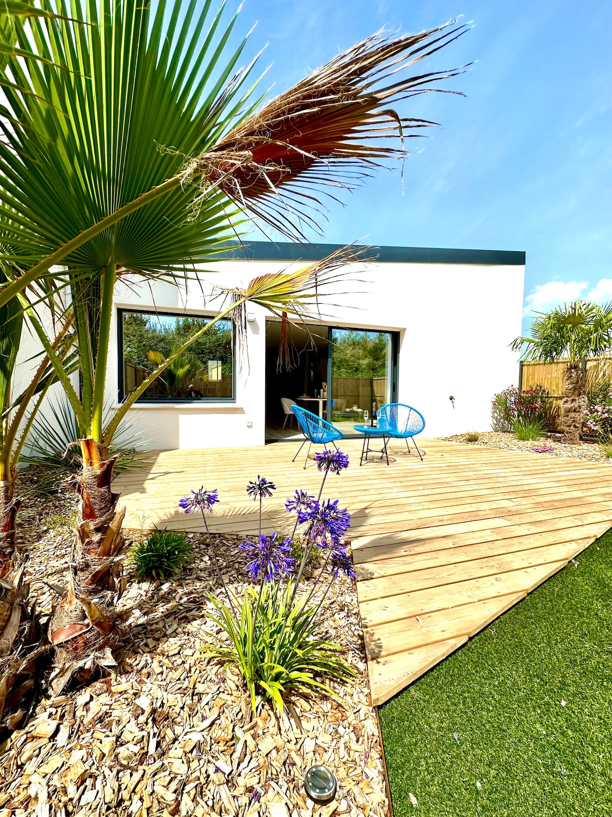 Ce Loft en duplex de 30m² (5min à pied de la plage), est fait et pensé pour un séjour bien-être à 2. Un véritable jacuzzi privatif, une salle de massage, lit queen size avec vue sur les étoiles et un jardin privé de 25m². Quartier très calme. Très Cosy, ce duplex est très bien équipé : cuisine aménagée, coupes à champagne, tout pour diner et petit déjeuner, micro-ondes, nespresso, canapé, tv connectée, leds, wifi, enceinte assistant vocal, spotify, wc séparé, douche, sèche serv, ext intimiste.