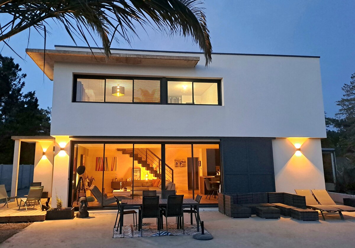 Modern & very bright chalet in solid wood composed of 3 bathrooms and a sauna. Walking distance from the Villa: forest protected area, beach access 400 meters away, water activities base and bike tours. Cozy atmosphere guaranteed! Ala Moana "On the way to the sea" in Hawaiian - Enjoy the sounds of the waves from a spacious garden, feet in the sand. - Ch 1: Double bed + double shower + XL bathtub - Ch 2: Double bed + crib - Ch 3: Double bed + Single bed - Mezzanine- Double sofa bed