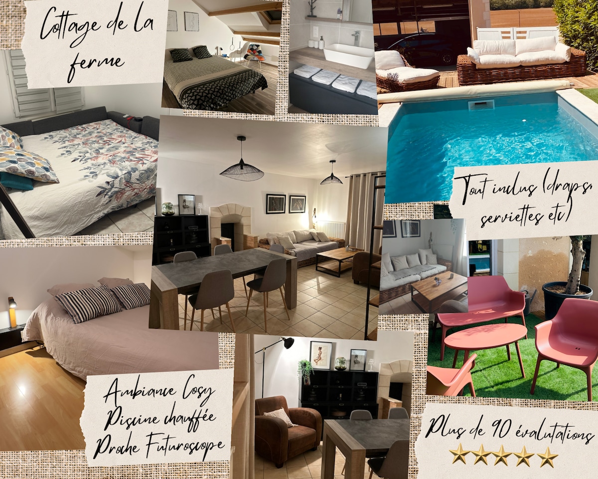Nous proposons un service tout inclus : draps, serviettes, produit de douche et café sont inclus vous laissant l’esprit libre à votre arrivée. Ce charmant cottage propose une escapade relaxante pour toute la famille. Avec sa piscine chauffée en été selon les conditions climatique, un coin bar, et un emplacement serein offrant une vue sur la nature environnante. Situé à 10 minutes du Futuroscope et de l'Arena, à 5 minutes du Golf de Saint Cyr, et à 15 minutes du centre-ville de Poitiers.