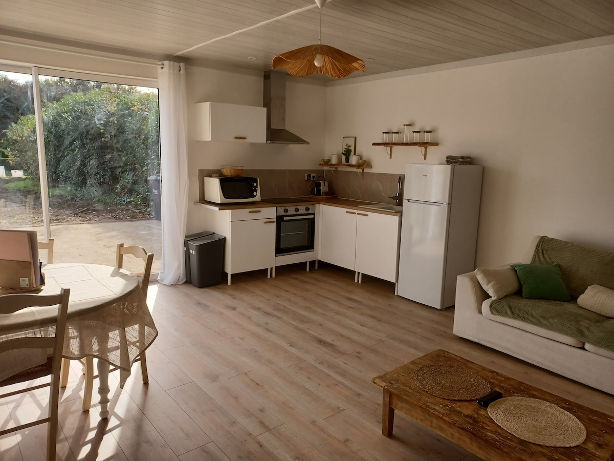 ☀️🏡 Profitez d’un studio lumineux, cosy et moderne avec jardin et terrasse. Il est composé d’une grande pièce divisée en deux espaces ; un côté salon avec un canapé lit (140*190) qui dispose d’un vrai matelas si besoin et un côté chambre avec un lit 140*190 cm. Le logement est spacieux, près de 30m2. 🍳 🚿 Vous trouverez également une cuisine équipée ainsi qu’une salle de bain et 1 WC 👤 Séjournez jusqu’à 4 personnes confortablement 🔑 Arrivées et départs autonomes 💰 Faible frais de ménage