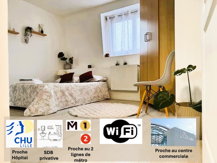 pratique, opérationnel , ideal pour un long séjour de travail, stage.. dans maison plein pied ( 3 chambres) sur la métropole Lilloise, à Faches Thumesnil, à 500 mètres de Lille et à proximité des commerces, transports en commun et autoroutes Grande chambre équipée de salle de bain et kitchenette à usage privée équipements privatifs : lit, armoires, tables, chaises, Bureau, ustentils, TV, WC,salle de bain douche.. équipements partagés: Terasse, jardin, laverie, sallon, local velo, WIFI...