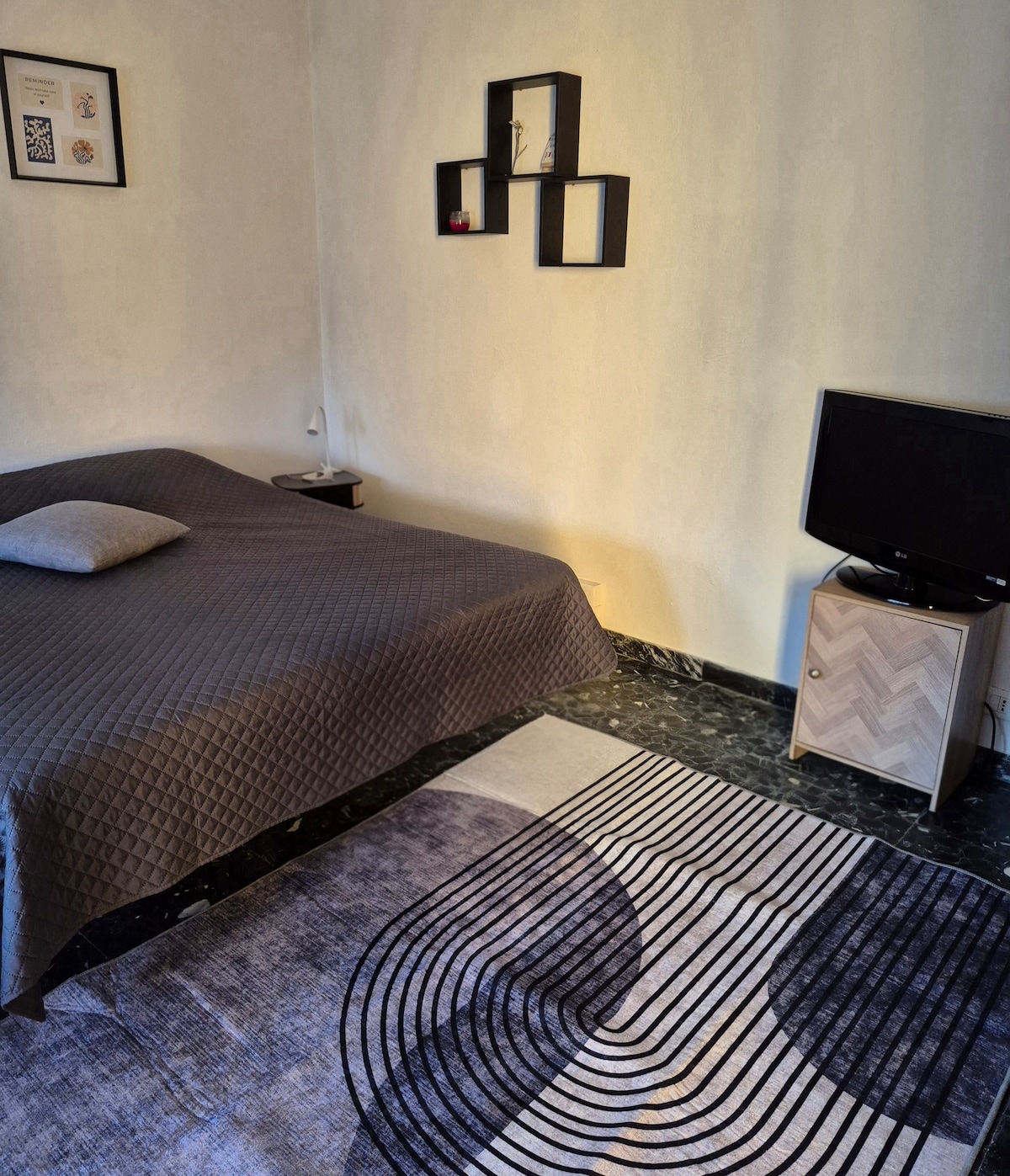 Offro mini appartamento a 300 metri dal mare composto da cucina-soggiorno (divano letto a 2 posti), camera con TV, letto matrimoniale e con letto singolo, giardino esterno attrezzato di tavolo, ombrellone, sedie. L'appartamento è dotato di grandi pale per refrigerare gli ambienti. La cucina è provvista di lavastoviglie, forno elettrico, forno a micro onde, frigorifero, tostapane, Mokona per caffè espresso e grande TV. Il bagno è provvisto di doccia con acqua calda, phon di una datata lavatrice.