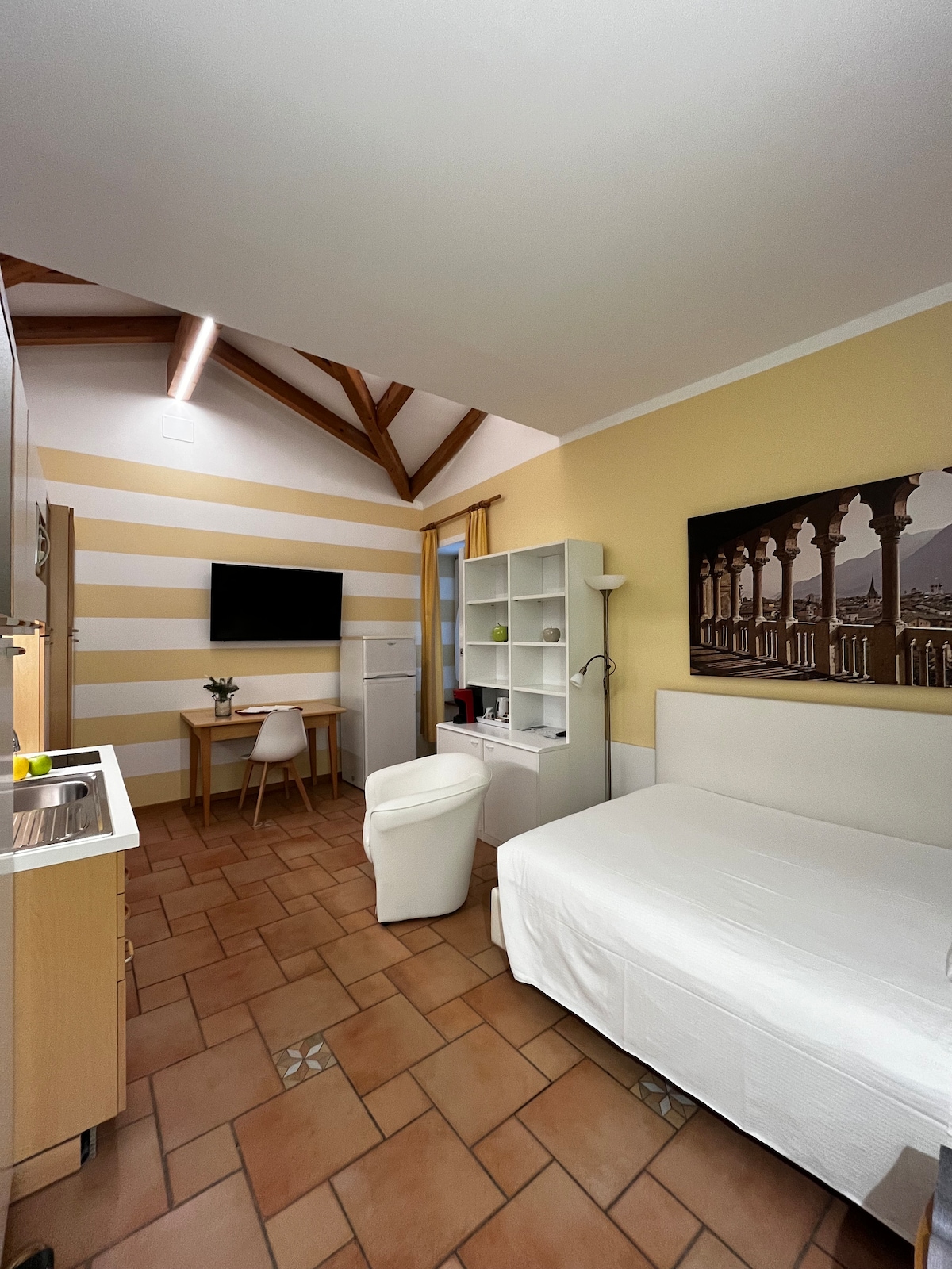 Comfortable and charming two-room apartment in the historic center of Padua. Large open space with independent access to the ground floor equipped with all services including kitchenette, bathroom and bed. Relaxation area with bed, sofa bed and second bathroom located in the basement. Connected to all bus and tram lines, nearest stop 3' walk (300m). Very close to the most important attractions of Padua. Also convenient for reaching the Padua hospital and only 28 minutes by train to Venice.