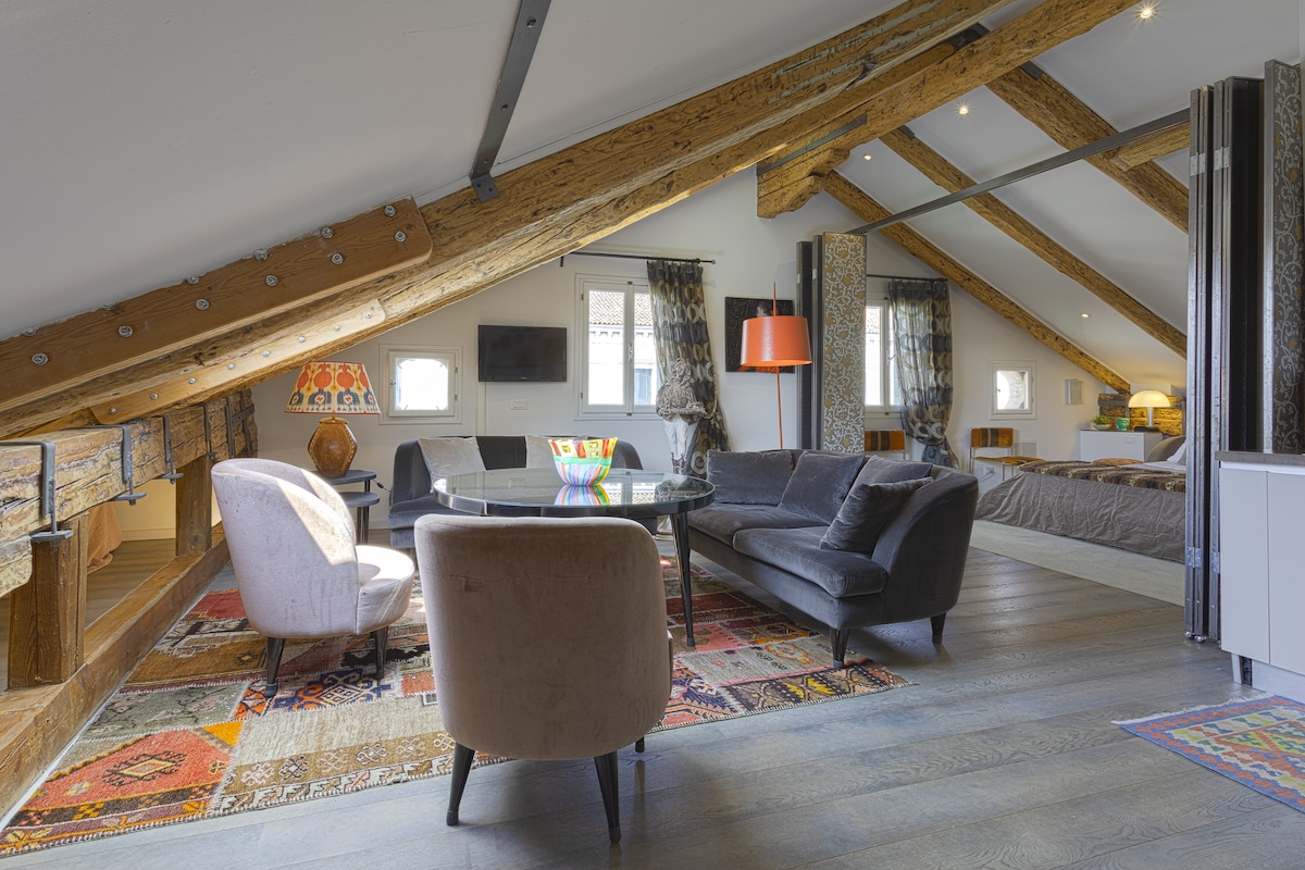 Accogliente appartamento con vista superlativa di 45 mq al terzo piano, situato nel cuore di Venezia, zona centralissima, strategica servita in maniera ottimale. L'appartamento è un loft con travatura a vista, composto da ingresso, angolo cottura, bagno, zona giorno verandata con divano letto matrimoniale, zona soppalcata con letto matrimoniale. L'appartamento è dotato di tutto il necessario: riscaldamento autonomo, frigo, TV, microonde, lavatrice, phon, aria condizionata, WiFi, lettino per bebè