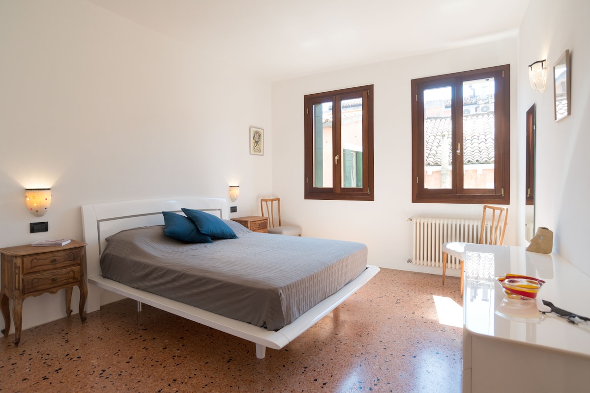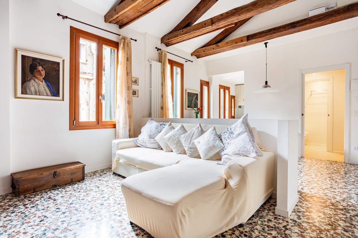 Admire the beauty of Venice from the arched windows of this welcoming and spacious apartment which combines historical elements, such as wooden beams, and contemporary furnishings. From the large windows you can enjoy a beautiful view of the canal, crossed by gondolas, and of the typical Gothic buildings of Dorsoduro, the most authentic district of Venice, appreciated by artists and intellectuals of all ages; equipped with two bathrooms and every comfort, you will find books and art objects.