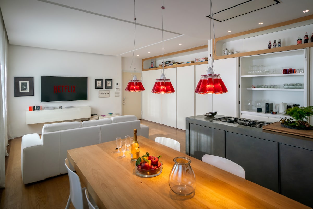 Located in the imposing complex of the former Stucky mill, Ca' dei Colori is an extraordinary apartment where everything is color and design, from the minimalist custom-made stainless steel kitchen counter to the beautiful oak and glass table designed by Carlo Mollino, dominated by the 1950s Sputnik chandelier, to the 12 framed pages of the very rare calendar that Steven Meisel created for Loewe, through a series of objects and furniture that make it unique and indispensable.