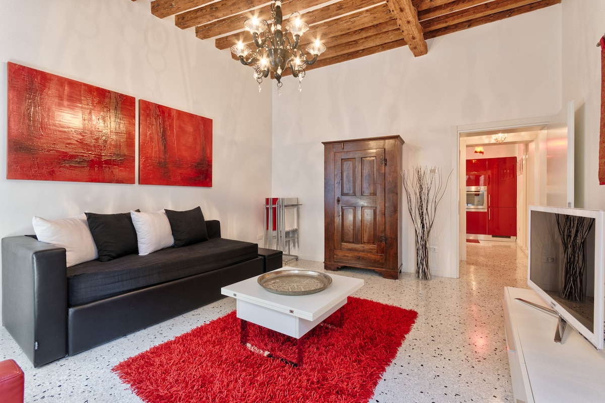 Admire the beauty of Venice from the arched windows of this welcoming and spacious apartment which combines historical elements, such as wooden beams, and contemporary furnishings. From the large windows you can enjoy a beautiful view of the canal, crossed by gondolas, and of the typical Gothic buildings of Dorsoduro, the most authentic district of Venice, appreciated by artists and intellectuals of all ages; equipped with two bathrooms and every comfort, you will find books and art objects.