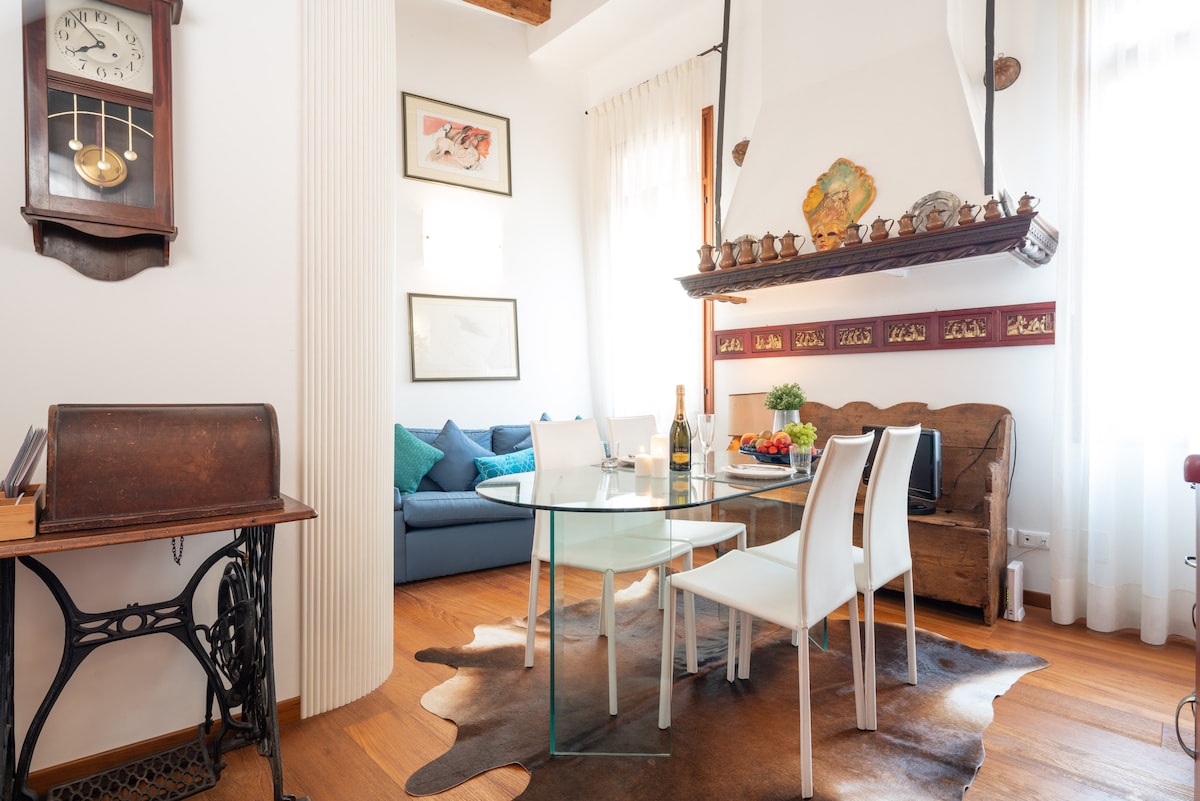 Skyline Home: morning Sun & rooftop views from the 3rd floor (no lift). Located 400m from S. Lucia Station, it features original Terrazzo floors, 19th-century furniture and a stunning Murano glass chandelier. Very quiet thanks to its elevation and double windows, it offers a spacious living area. Full Tech: Fiber Wi-Fi & Silent A/C. Authentic Venice at its best: Located in S. Croce with restaurants and “bacari” downstairs. 50m from supermarket & 100m from vaporetto. cod. Reg. Ve. M0270422670