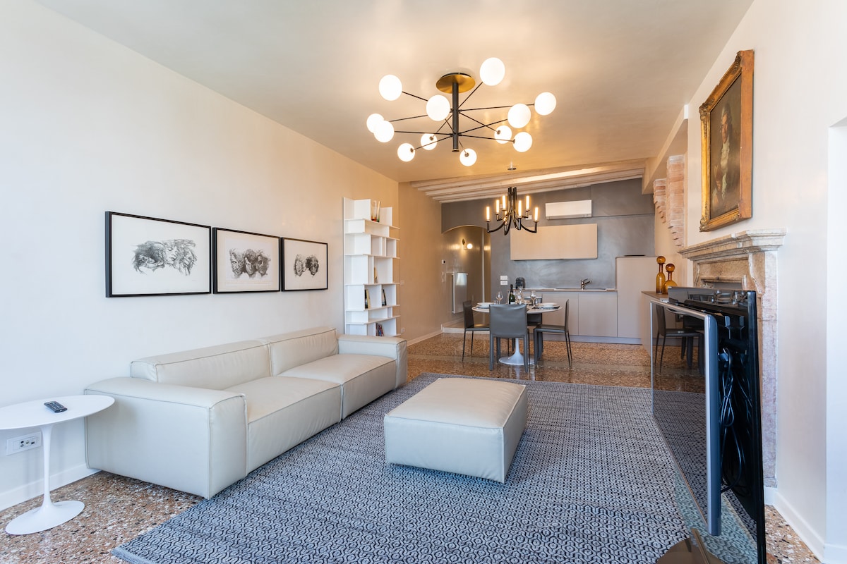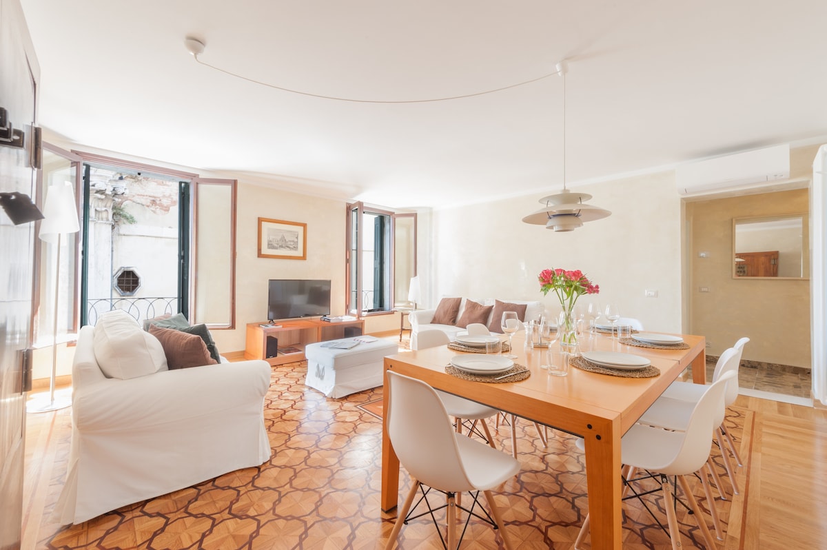 Elegant two-bedroom, two-bathroom apartment in perfect location. Located on the third floor of a building which dates back to the 1600s, the apartment is right in the heart of Venice and overlooks a typical campo (square) on one side, and a canal on the other side. It is located 5 minutes by foot from Rialto bridge (where the Airport shuttle docks), 9 from Saint Mark's Square, 15 from the train station and is surrounded by infinite lovely restaurants, cafés and shops.