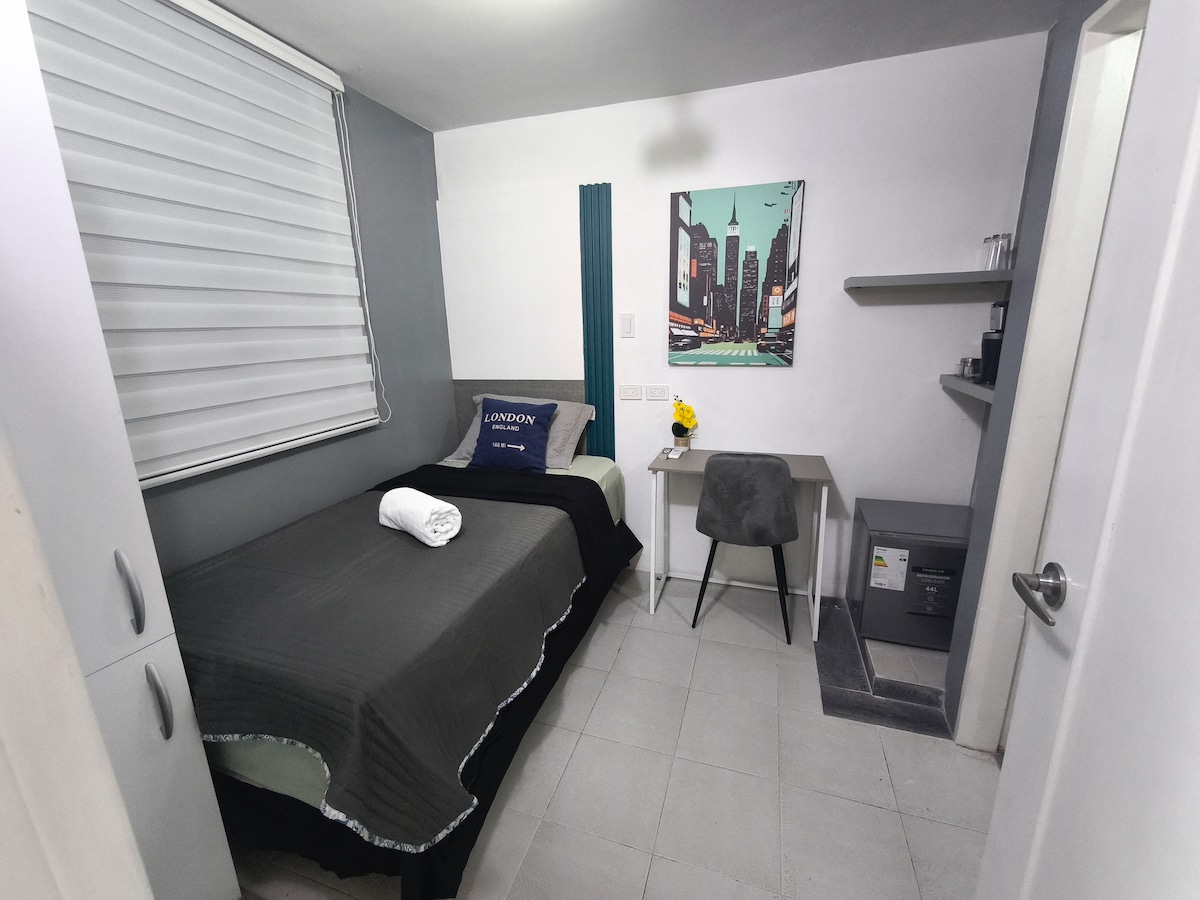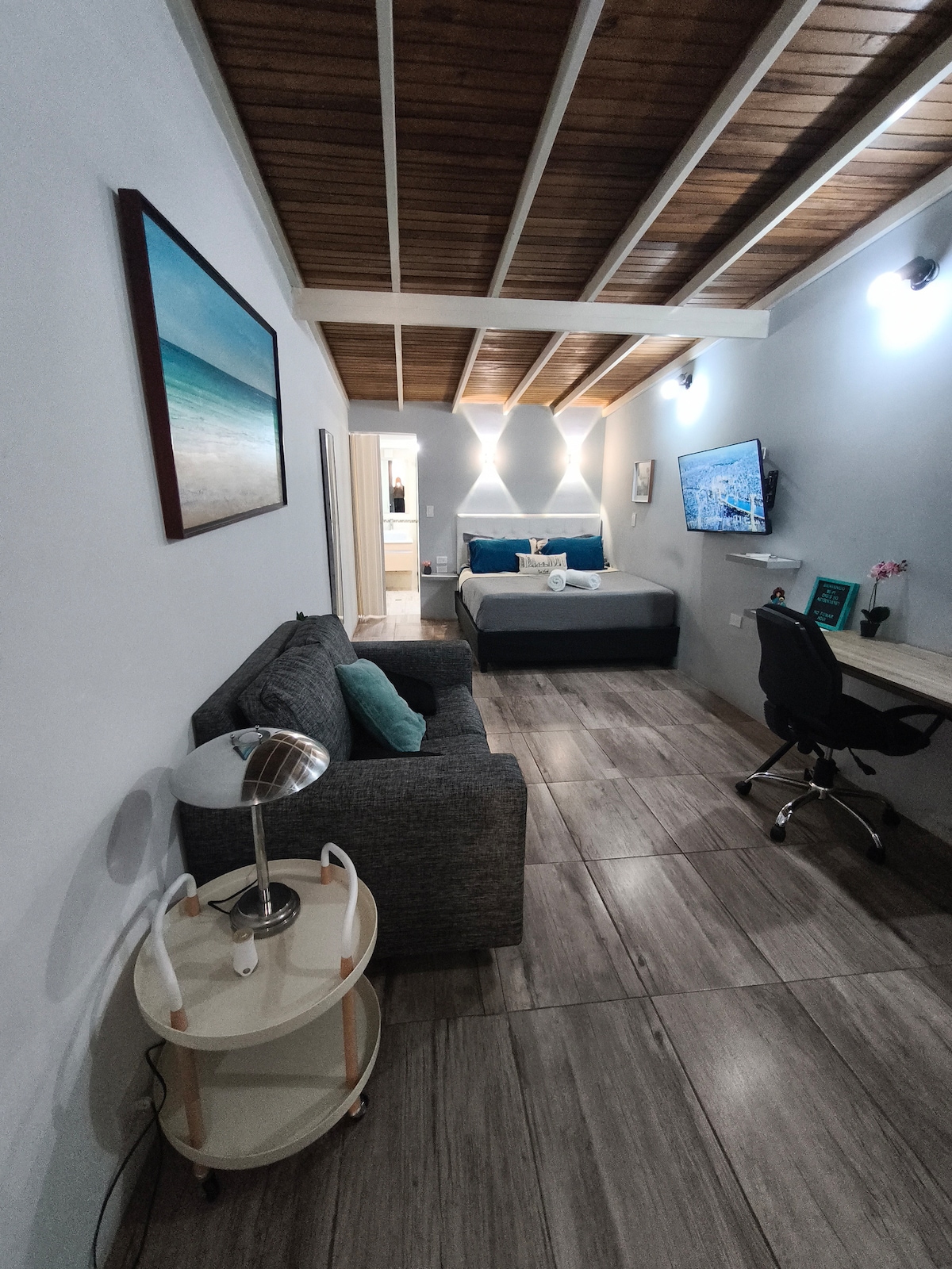 ✨ Suite acogedora con vistas a jardines y parrillera. Posee entrada independiente y un balcón privado ideal para el café. El suite cuenta con cama queen, A/C, persiana blackout. La sala es funcional, con mesa de doble uso (comedor/escritorio), y un comedor en el área de cocina. Equipada :2 opciones WiFi,smart TV + cable, cocina con horno, microondas y el gran plus de lavadora y secadora. Baño cómodo. Disfruta de un clima fresco de montaña y total tranquilidad en un ambiente seguro y remodelado.