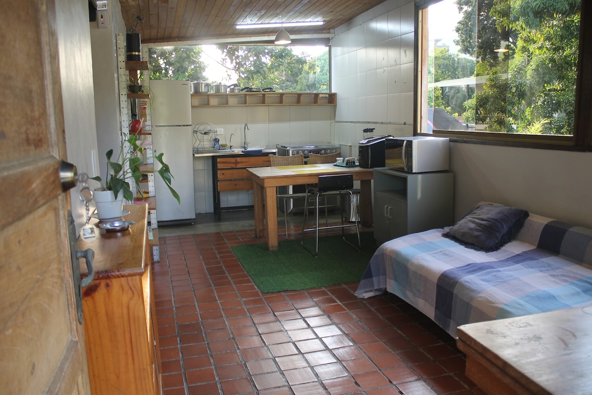 Apartamento anexo a la vivienda , independiente , ubicado en área de jardín / Consta de una habitación , con cama Queen , baño completo y lavamanos extra . Walk in closet - El espacio de sala-comedor está integrado a la cocina, full equipada con nevera, freezer, hornillas y horno. Las ventanas permiten la entrada de luz natural Es un espacio muy agradable. En la sala se tiene un cómodo escritorio y un sofá cama , para solicitud de huésped extra Lavadora/ sacadora privada Clima de montaña