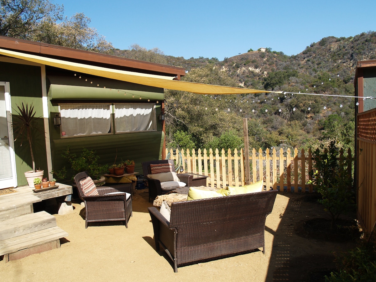 Charming Robin’s Nest, Vintage trailer extended Topanga style to little house, lovely fenced yard with bbq, shade and lounge seating. incredible views of Santa Monica mountains, on 4 acres, walking distance to Topanga State Park. Boogies boards, beach towels for short drive to Topanga Beach. Unwind, take in the views, secluded, perfect to explore Topanga's secret swimming holes, spring fed creek, hiking/biking trails. Books, board games, puzzles etc. when our hens are laying some fresh eggs.