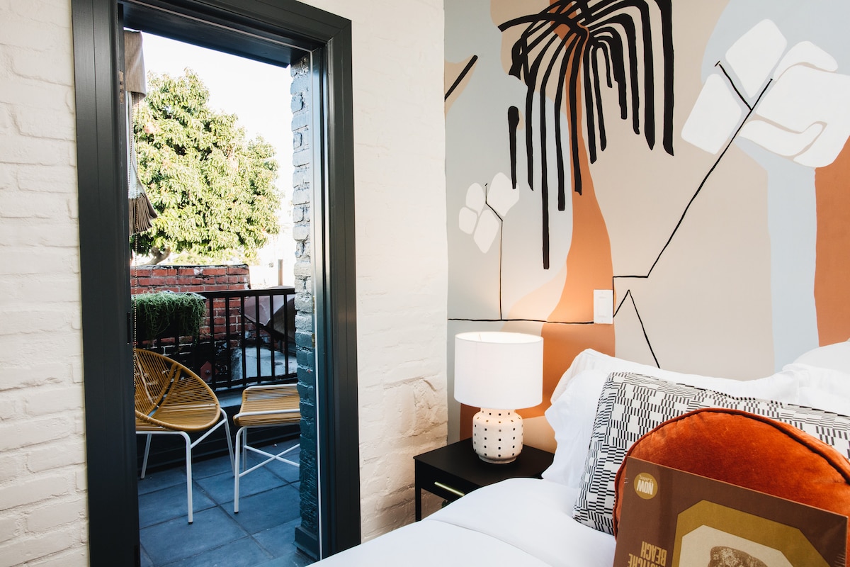 This adorably compact room features a hand-painted mural by local artist Kristi Head. Drift off on the full bed or soak up the sun on our only balcony. Back inside, a cassette player and vintage tapes take you straight to the ‘80s. Noise level: Low – Medium Location: Top floor View: City