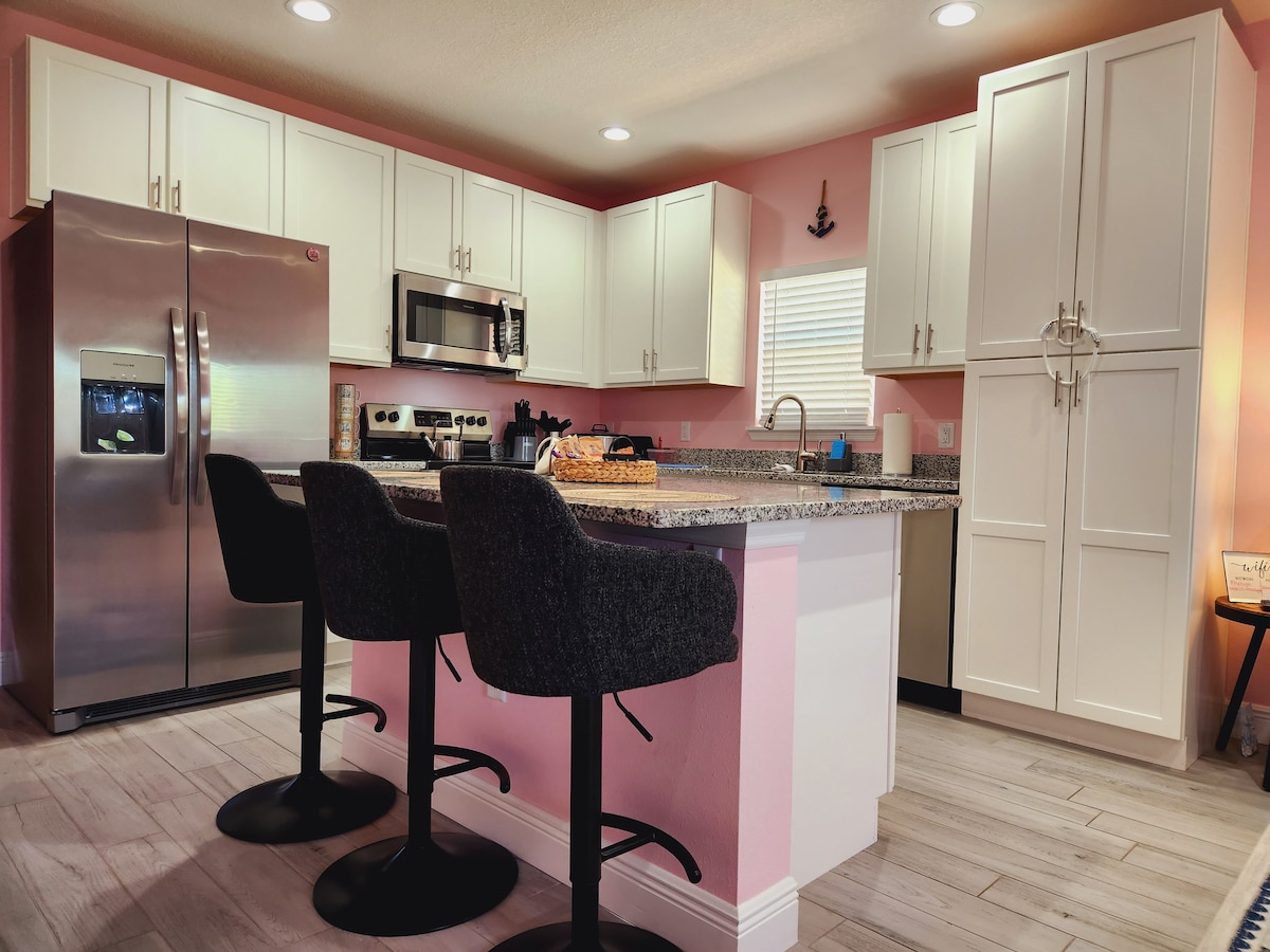 Welcome to Vistalodgings Villa Del Sol where families have fun ☀ 3 bedrooms: 1 king, 1 queen, 1 full, 1 twin bed and 2 full bathrooms ☀ Fully equipped kitchen: Keurig dual coffee maker, waffle maker, air fryer, electric kettle, blender, mixer, pots and pans ☀ Dining area for 8 ☀ Fast speed internet Wi-Fi ☀ Heated pool free of charge ☀ EV charger ☀ Shuffleboard, Pac-man arcade ☀ 5 Smart TVs with Disney Plus ☀ Bikes, beach chairs, umbrellas, cooler, beach toys ☀ Iron